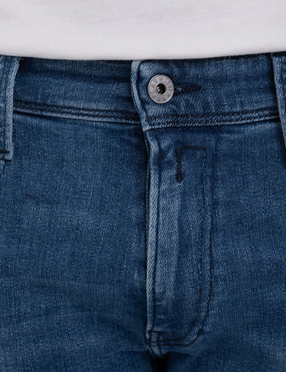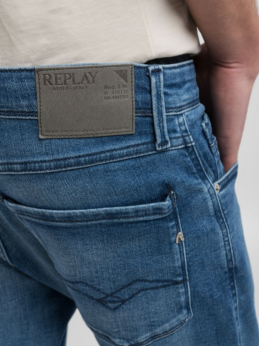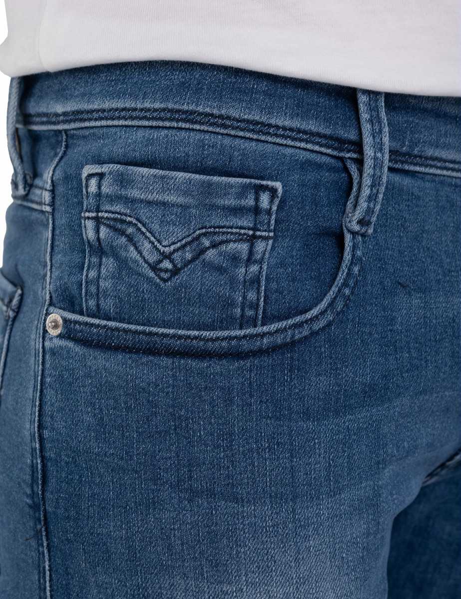 Slim-Fit-Jeans mit normaler Taille und schmal zulaufendem Bein. Die Five-Pocket-Hose ist aus 12-oz-Power-Stretch-Indigo-Denim aus einer Baumwollmischung in mittlerer Waschung gefertigt. Die Enzymwaschung im Stonewash-Verfahren und die handgefertigten Moustaches und Schleifspuren erzeugen Farbkontraste in den Verschleißbereichen, die den Street-Style und die moderne Optik des Kleidungsstücks betonen. Die fünfte Tasche und die Gesäßtaschen, von denen eine mit einem R bestickt ist, sind mit der ikonischen geschwungenen Naht versehen, während sich auf einer der Vordertaschen ein kleiner Einsatz mit Logo befindet. Verschluss mit Knopf und Reißverschluss.