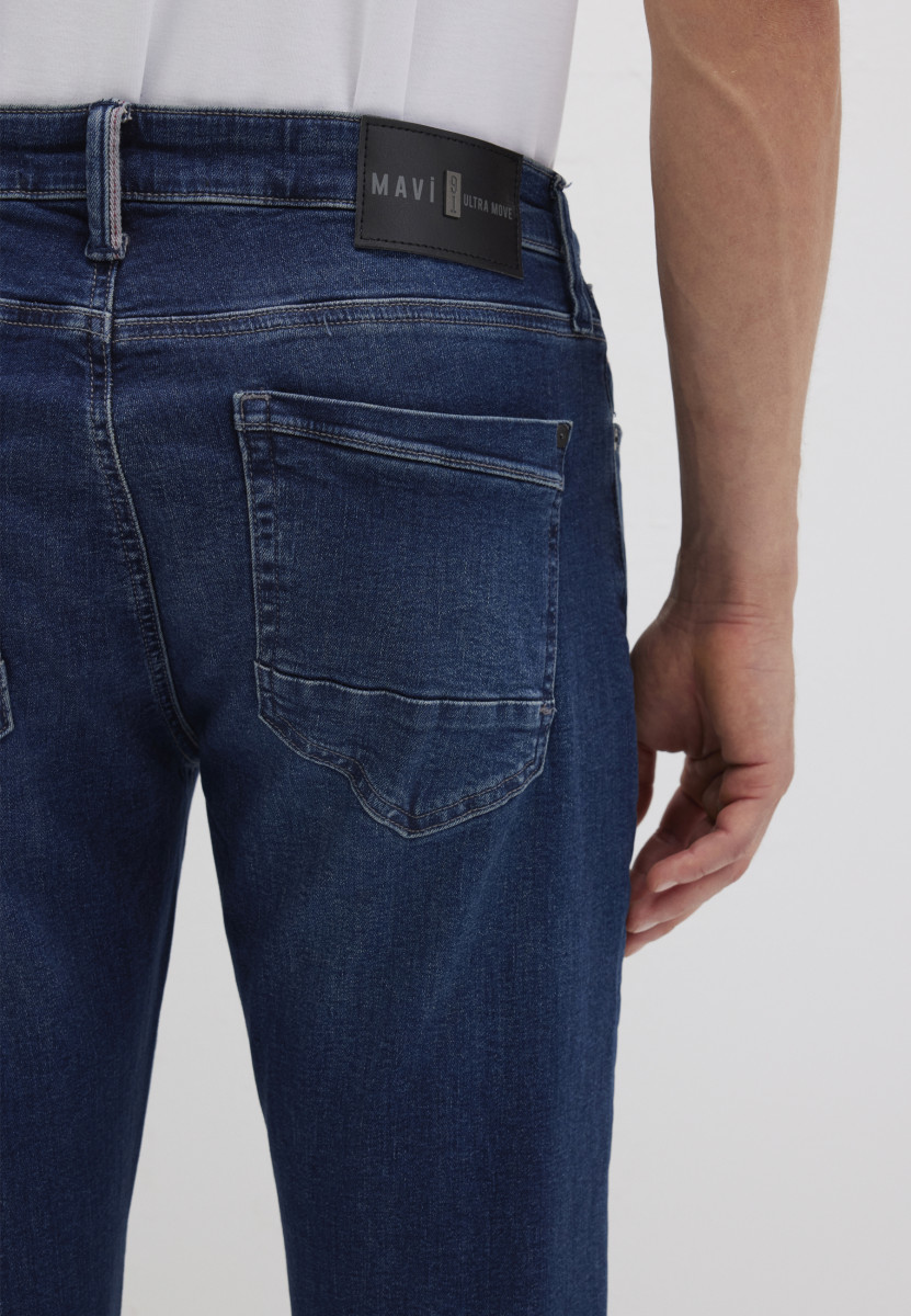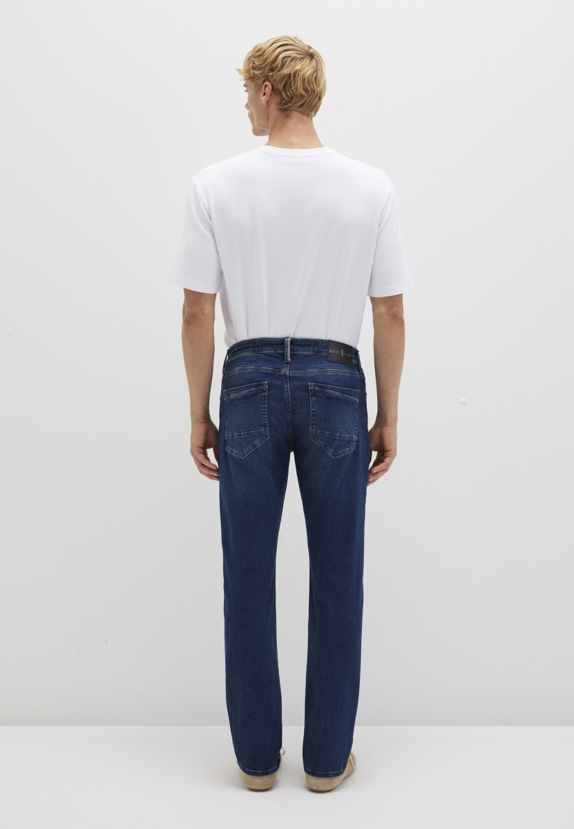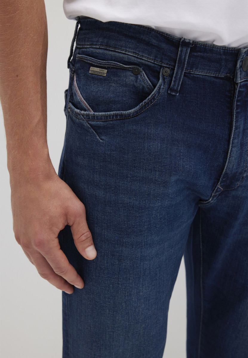 Slim Straight | Gerader Beinverlauf | Normalhoher Bund | 5-Pocket-Style | Reißverschluss | Leichte Denimqualität mit mittlerem Stretchanteil | Dunkle Waschung in stark ausgewaschener Optik