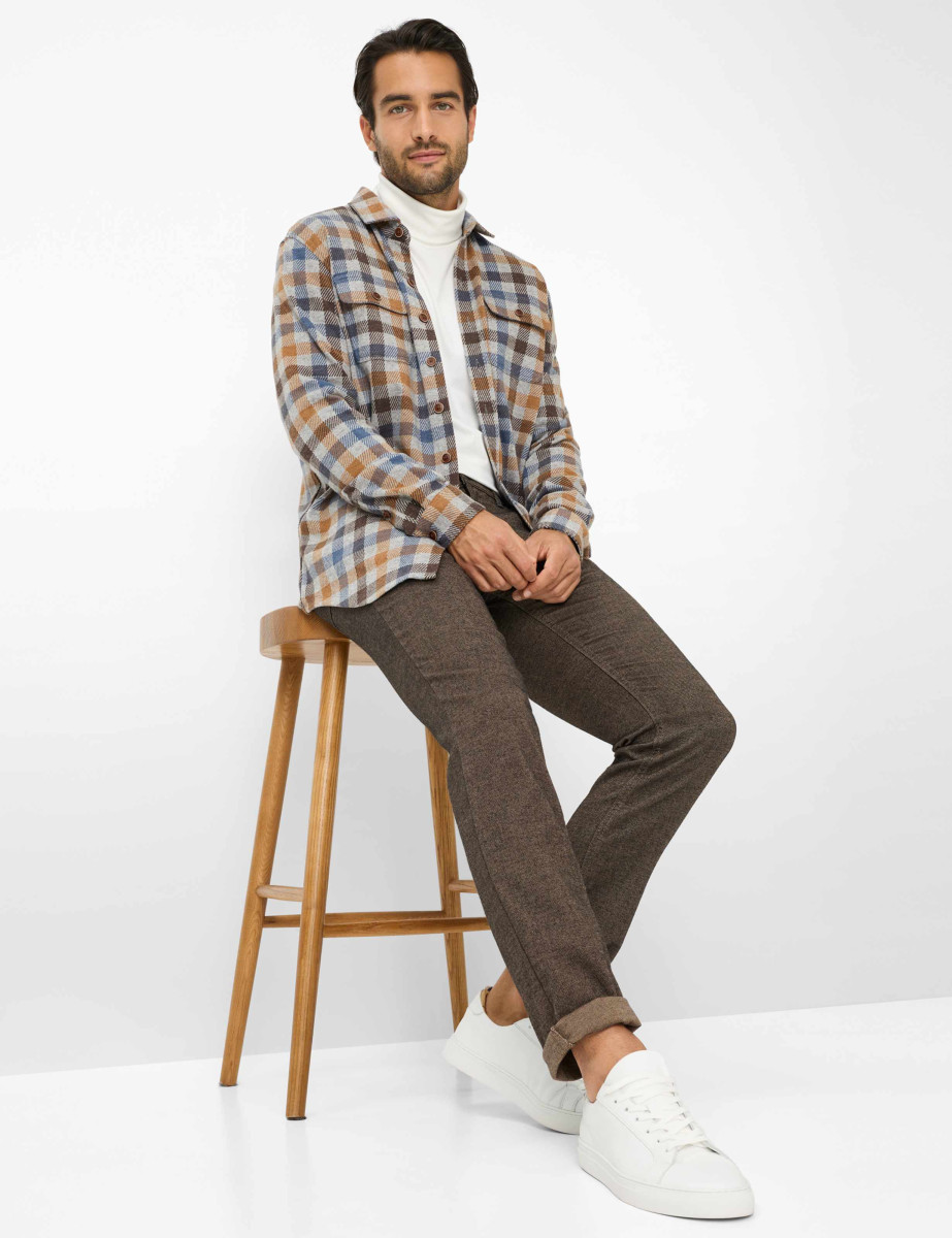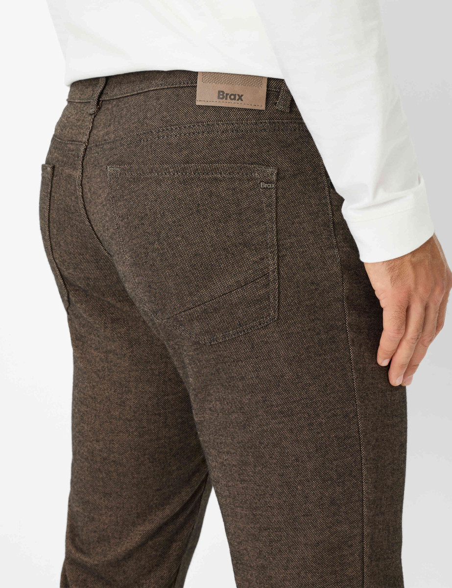 Für die kalte Jahreszeit präsentiert sich die Five-Pocket-Hose im Style CHUCK als trendiges Must-have, das maskuline Eleganz auf moderne Weise interpretiert. Ihr Modern Fit mit schlanker Silhouette und normaler Leibhöhe formt eine klare Linie, die durch den verdeckten Reißverschluss sowie klassische Taschenlösungen wie Coinpocket und aufgesetzte Gesäßtaschen authentisch betont wird. Kleine Ziernieten und ein Besatz in Lederoptik setzen dezente Akzente bei der smarten Five-Pocket.. Besonders charakteristisch ist die wollähnliche Optik, die der Herrenhose eine elegante Nuance verleiht - ob für Freizeit oder Business. Der hochwertige Baumwollmix bietet Strapazierfähigkeit, angenehmen Tragekomfort und natürliche Atmungsaktivität. Die Woolook Flex-Qualität kann aber noch mehr. Neben der authentischen Wolloptik bietet die Hose komfortable Stretcheigenschaften, sodass Bewegungsfreiheit und Formstabilität perfekt zusammenspielen.