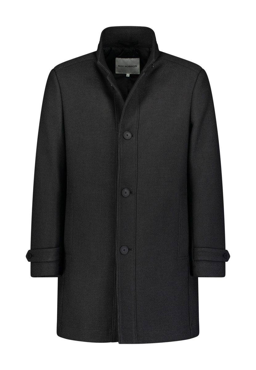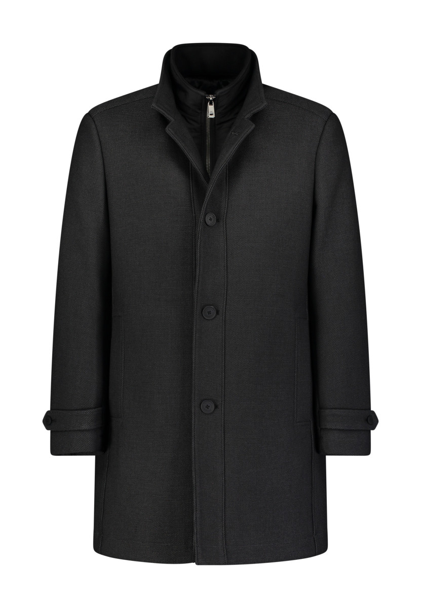 Dieser elegante schwarze Herrenmantel überzeugt durch seine zeitlose Silhouette und funktionale Details. Der moderne Stehkragen mit Reißverschluss und die verdeckte Knopfleiste sorgen für ein minimalistisches, stilvolles Design, das sowohl im Büro als auch in der Freizeit überzeugt.