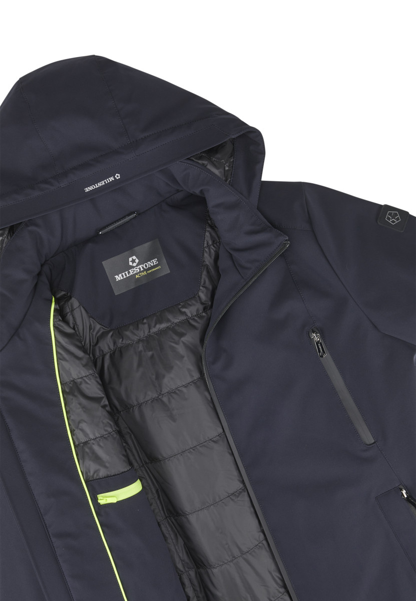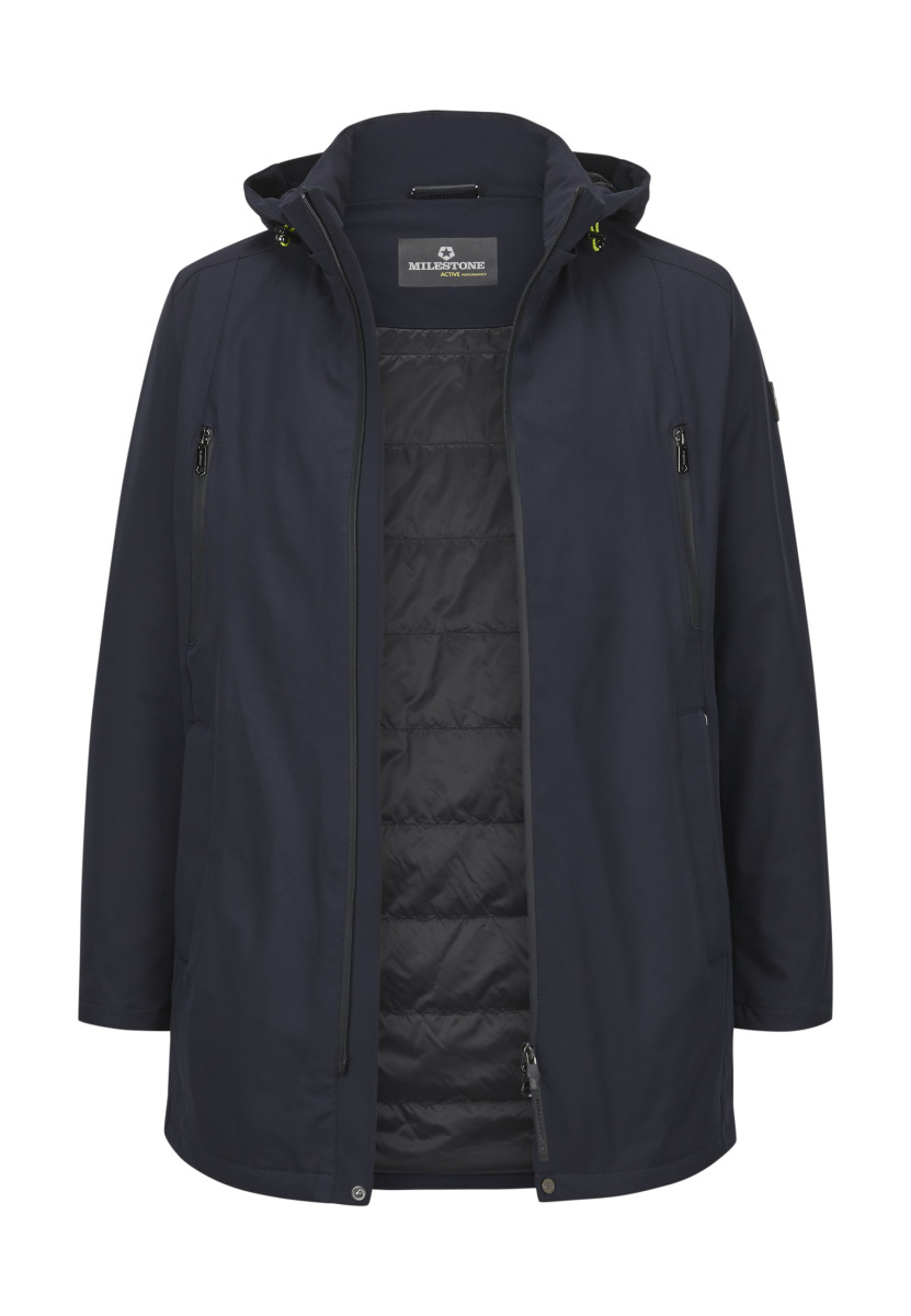ACTIVE PERFORMANCE Wasserabweisender Parka mit abtrennbarer Kapuze. Dieser mittellange Parka ist aus einem leichten Membrangewebe mit einer 5.000mm Wassersäule gefertigt, das sich besonders weich anfühlt. Die Seitentaschen mit Heatpressed Verarbeitung, die Innenblende mit Logo-Laserung und der Waterproof Front-Reißverschluss unterstreichen den Minimalismus des Designs. Die Passform und der Komfort des Kleidungsstücks werden durch den elastischen Oberstoff unterstützt. • Oberstoff: elastische funktionelle 3-lagige Qualität mit Membran, atmungsaktiv / wasser- und winddicht, Wassersäule 5.000mm • Parka mit leicht tailliertem Schnitt • Abtrennbare Kapuze mit Logo Print • Hochabschließender Kragen • Innenblende mit Logo Laserung • Die Nähte sind nicht verschweißt • Gestepptes Futter mit Neon-Farbakzenten • Heat-Pressed Verabeitung an seitlichen Reißverschlusstaschen • Brusttaschen mit Waterproof-Reißverschluss • Schließt mit 2-Wege Waterproof-Reißverschluss • Logo-Badge am Ärmel • 2x Innentaschen mit Reißverschluss und Funktionsprint • Nachhaltige DUPONT SORONA®AURA Isolierung. Die Isolierung besticht durch ihre Leichtigkeit und optimaler Wärmeisolation. Die Wattierung besteht zum Teil aus nachwachsenden, pflanzlichen Rohstoffen.