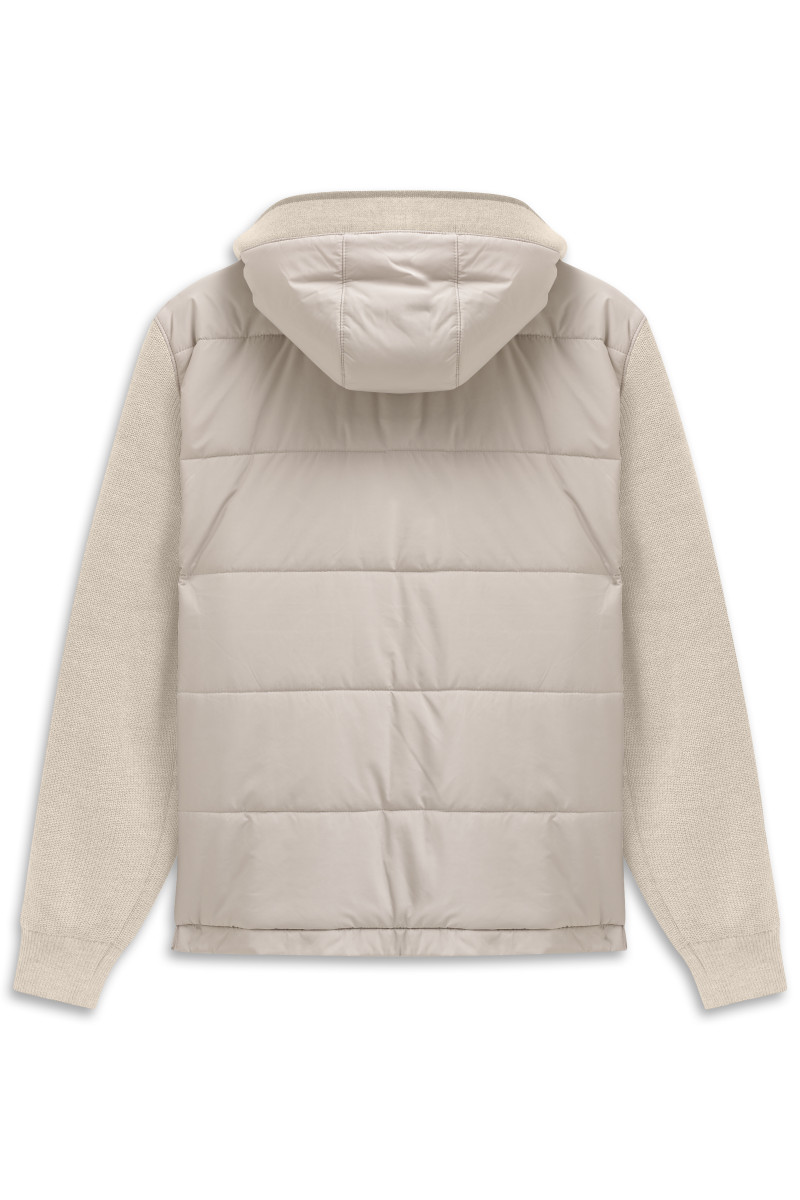 Strick Hybrid Jacke mit Stehkragen und Kapuze, VT + RT aus Nylon, VT mit RV und zusätzlicher Knopfleiste mit Druckknöpfen, Leistentaschen und bugatti Metallplakette am Ärmel