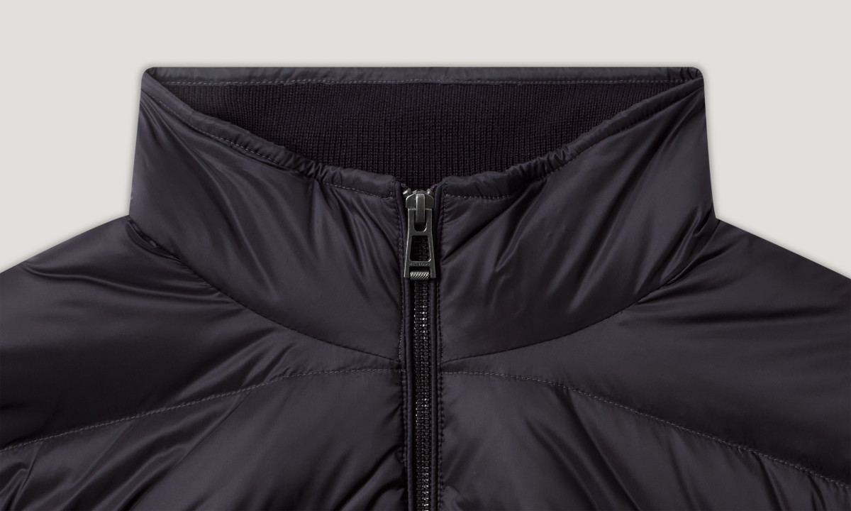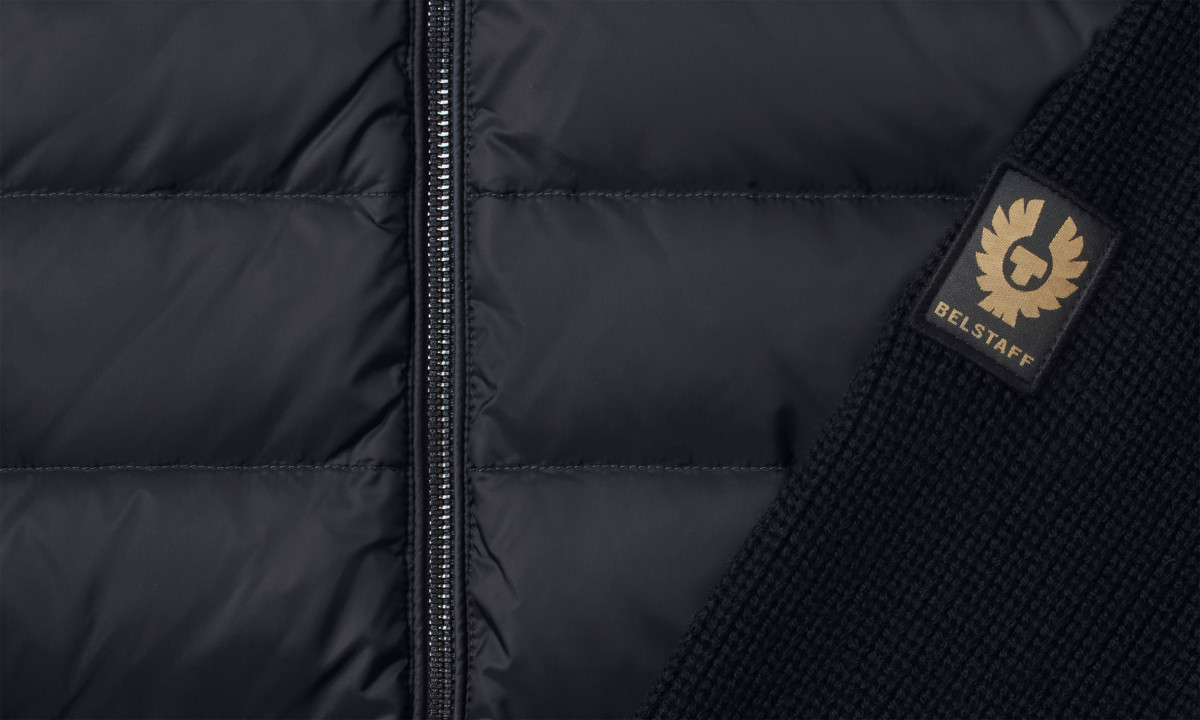 Hochdichter, wasserabweisender Nylonstoff | Leicht und komprimierbar | Bündchen und Saum in Rippenstrick | Ärmel und Rückenbahn aus Strick | Hüfttasche mit Druckknopfverschluss | Gestickter Belstaff-Phönix-Aufnäher am linken Ärmel | Reißverschluss vorne in der Mitte | Recyceltes Nylon | Wolle ohne Mulesing
