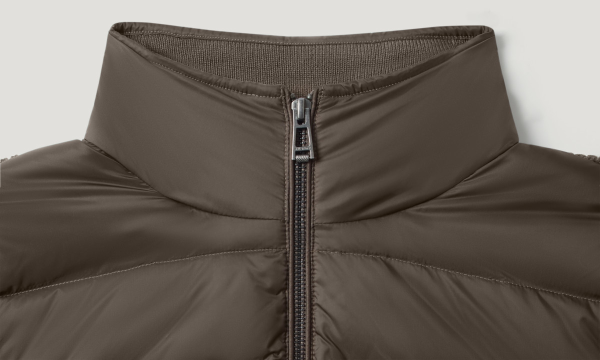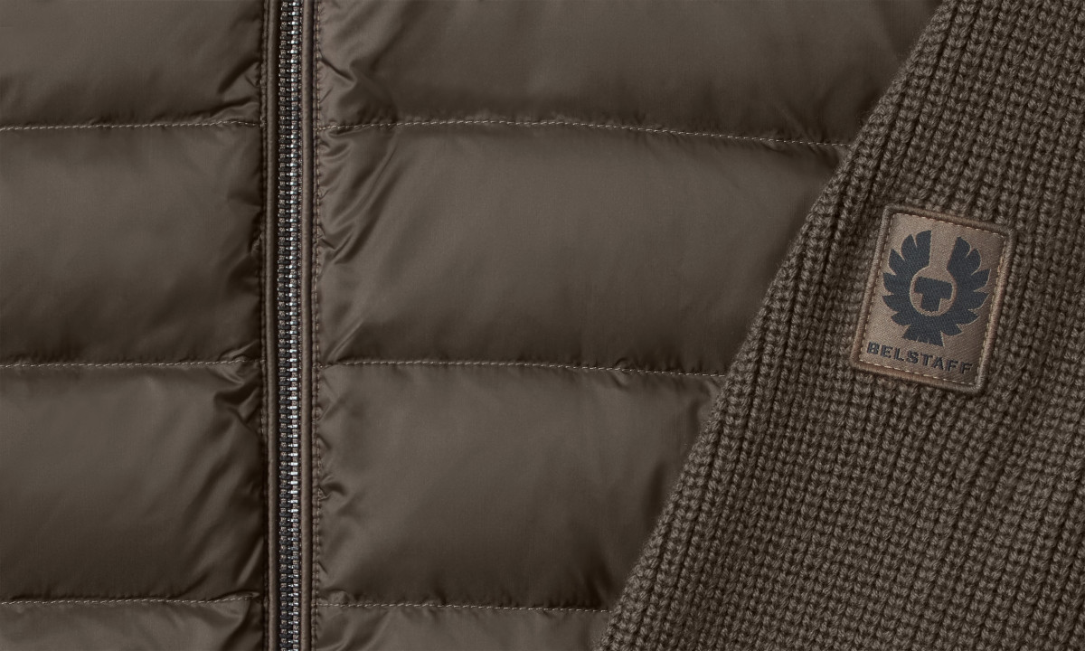 Hochdichter, wasserabweisender Nylonstoff | Leicht und komprimierbar | Bündchen und Saum in Rippenstrick | Ärmel und Rückenbahn aus Strick | Hüfttasche mit Druckknopfverschluss | Gestickter Belstaff-Phönix-Aufnäher am linken Ärmel | Reißverschluss vorne in der Mitte | Recyceltes Nylon | Wolle ohne Mulesing