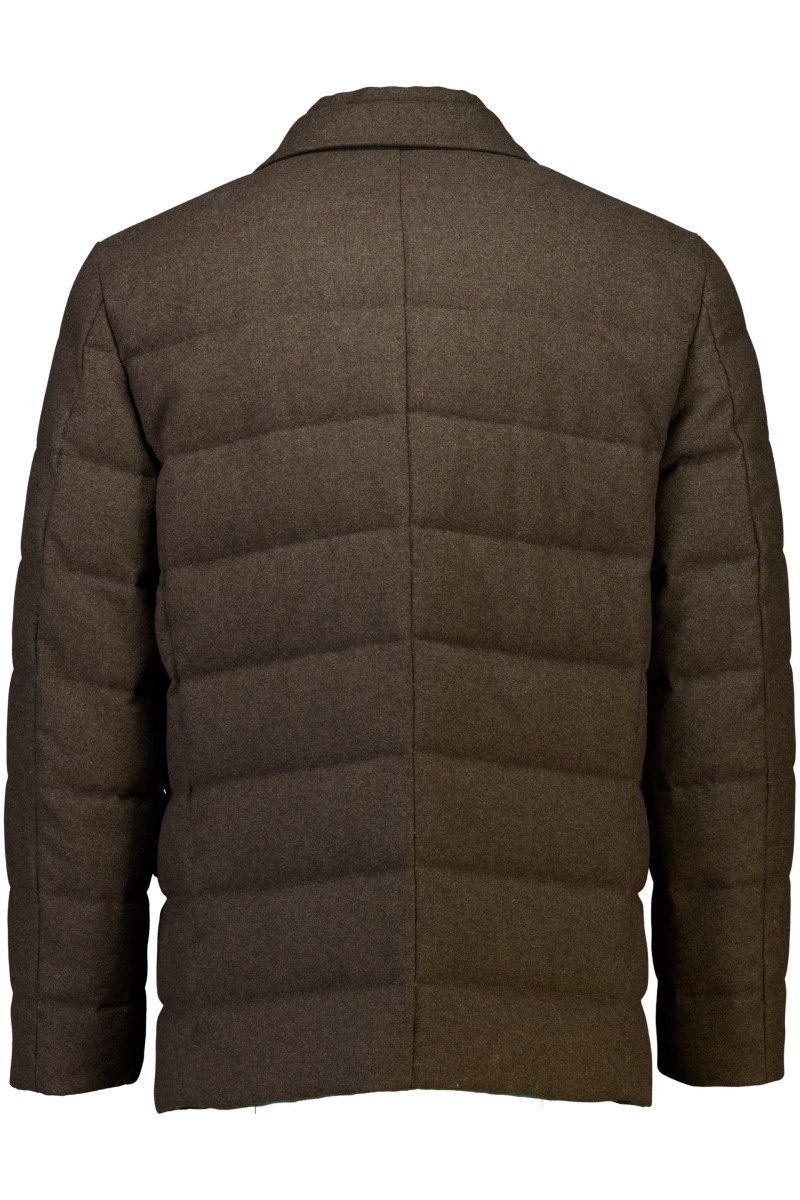 Moderne Jacke aus einer Wollmischung und einer wärmenden Füllung aus 90% Daunen. Die Jacke hat zwei Seitentaschen mit Patten, eine offene Brusttasche und zwei Innentaschen mit Reißverschlüssen. Sie schließt mit Knöpfen und einem 2-Wege-Reißverschluss, den man für zusätzliche Wärme bis zum Kinn schließen kann.