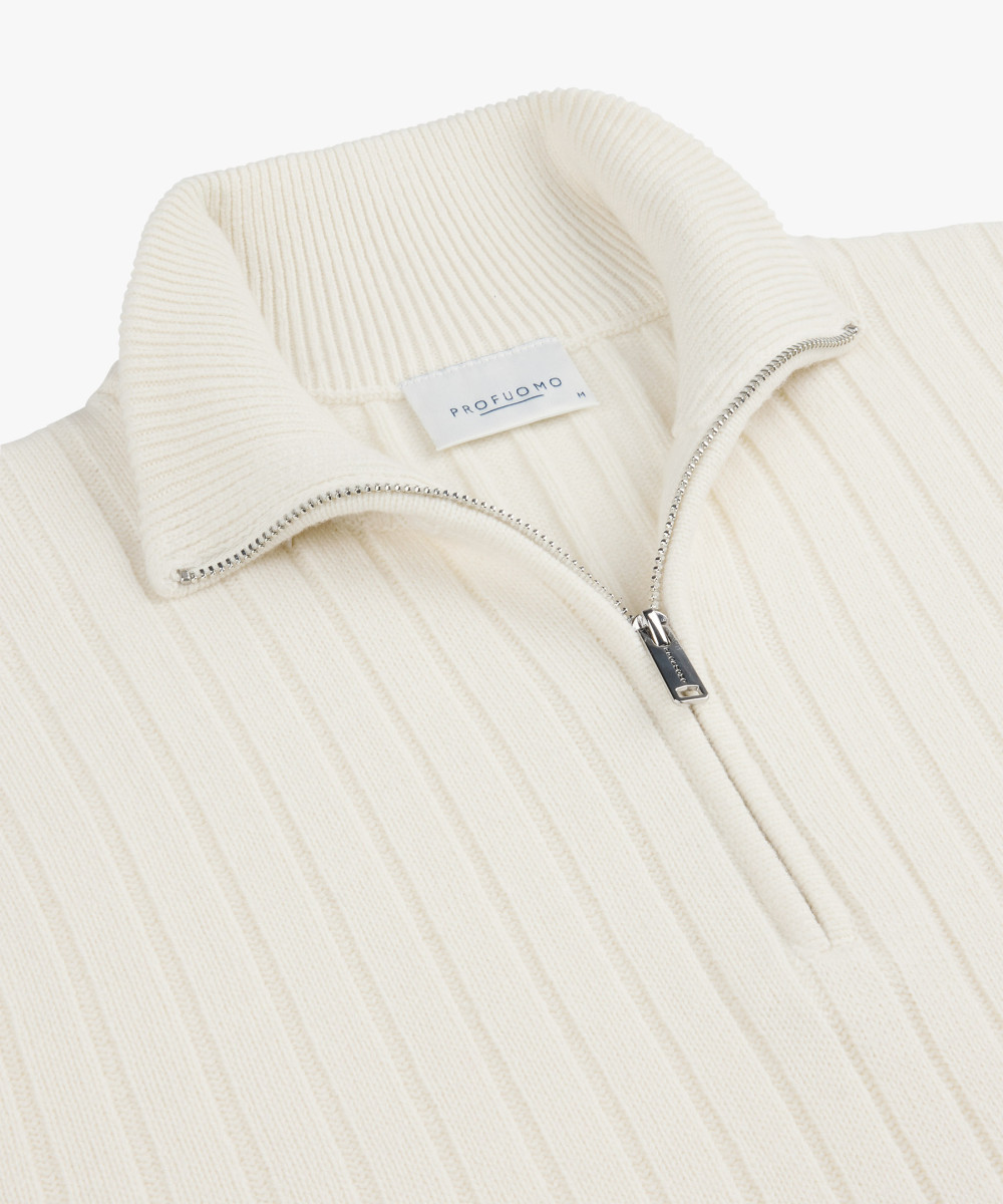 Dieser Herren-Strickpullover mit Reißverschlusskragen in Off-White vereint klassisches Design mit moderner Funktionalität. Die dezente Rippenstruktur verleiht dem Pullover eine edle Textur, während der Half-Zip-Kragen sowohl stilvolle als auch praktische Akzente setzt.