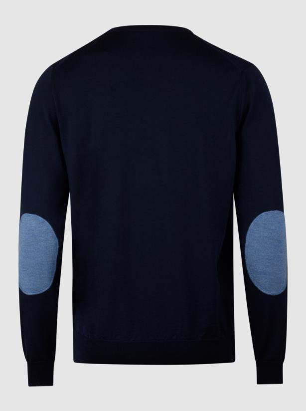 Dieser Pullover mit Rundhalskragen ist aus Merinowolle gefertigt. Der Pullover hat Ellenbogenaufnäher und Rippstrickbündchen an den Ärmelenden, am Kragen und am Saum unten.