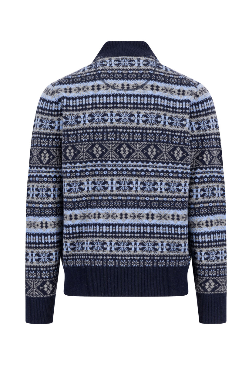 Dieser warme Herren-Strickpullover ist der perfekte Begleiter für kalte Tage und ein zeitloses Statement in Ihrer Wintergarderobe. Das traditionelle Fair Isle Muster (auch bekannt als Norwegermuster) in den harmonischen Tönen Blau und Grau verleiht dem Pullover einen klassischen, aber zugleich modernen Look.