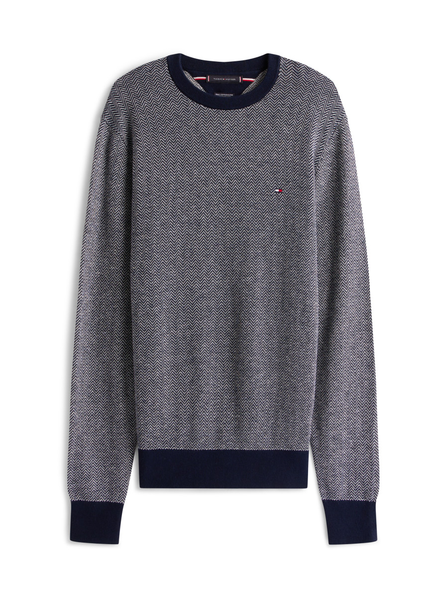 Dieser elegante Strickpullover ist ein zeitloses Basic, das Ihrem Outfit sofort eine gehobene Note verleiht. Er kombiniert ein schlichtes Design mit einem raffinierten Allover-Fischgrätmuster (Herringbone) in einer harmonischen Farbgebung aus Dunkelblau/Navy und Weiß-Grau.