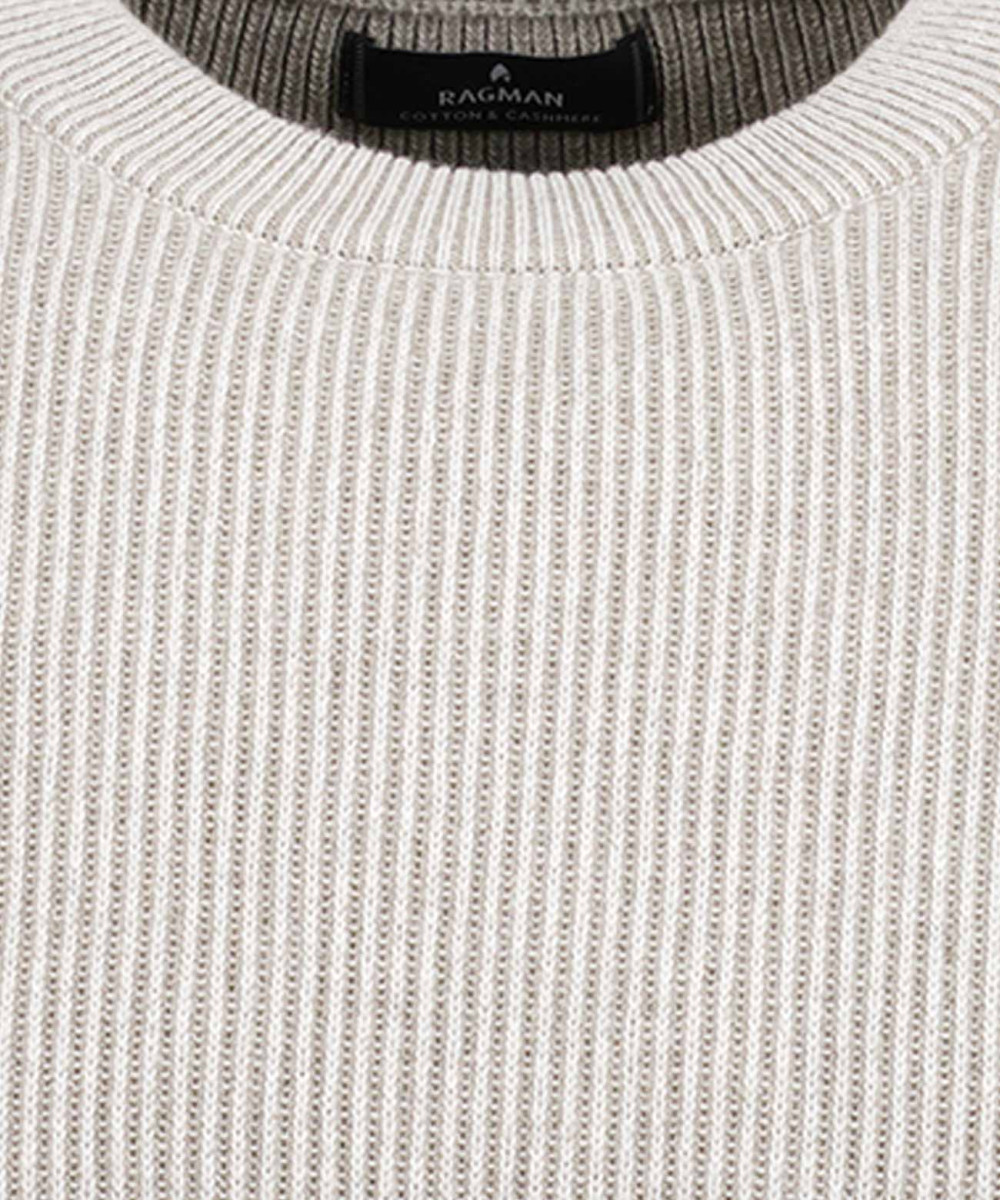 Hier gibt es gleich 3 Rivalen: zum einen der schöne Bicolour-Strick, zum zweiten der coole Rippenstrick und zum dritten die hochwertige Baumwoll-Qualität, die mit Kaschmir "gespickt" ist. Ein Gesamtpaket eines wunderschönen RAGMAN-Pullovers, das als solches perfekt vereint ist und einen Ehrenplatz im Männerkleiderschrank verdient. Mit modischem Rundhals und Rippenbündchen in 1x1-Rippe.