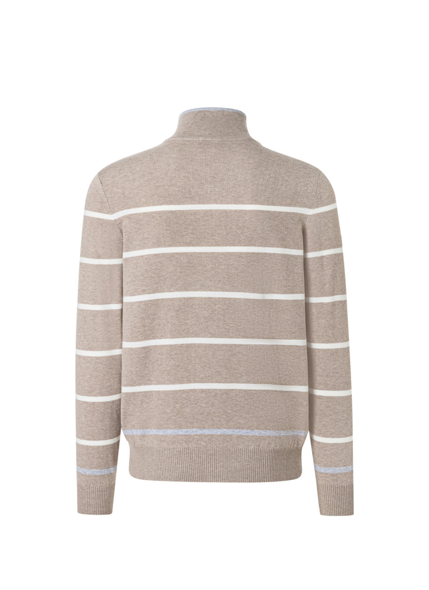 Dieser stilvolle Feinstrickpullover überzeugt mit einem sportiv-eleganten Design und hoher Vielseitigkeit. Der Stehkragen mit kurzem Reißverschluss verleiht dem Modell eine moderne Note und ermöglicht variable Tragemöglichkeiten – offen für einen lässigen Look oder geschlossen für mehr Wärme und Struktur. Das dezente Streifenmuster sorgt für eine zeitlose Optik und macht den Pullover zu einem idealen Begleiter für gepflegte Freizeit- und Casual-Outfits.
