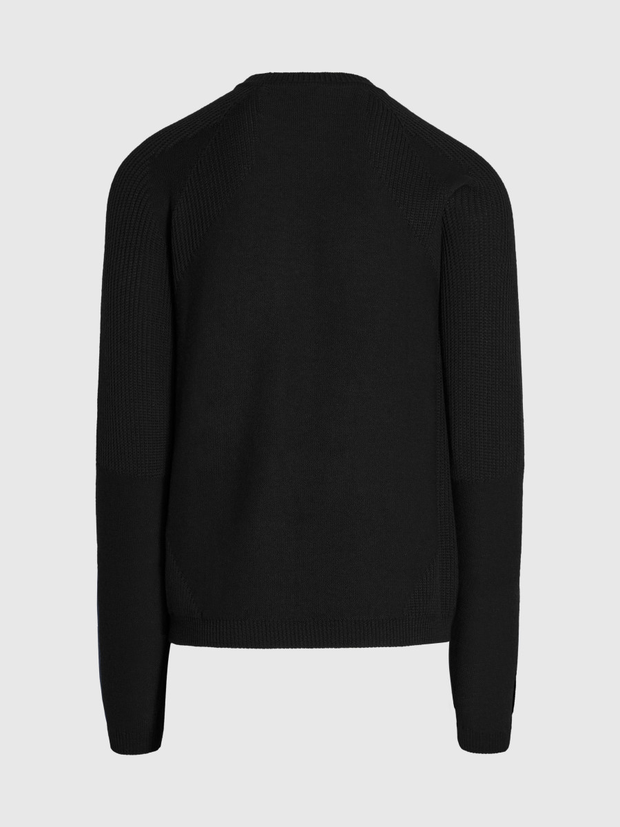 Ein nahtloser 3D-Strickpullover für Herren mit Rundhalsausschnitt im Regular Fit. Das Stück zeichnet sich durch ein nahtloses Strickverfahren für maximalen Komfort und Bewegungsfreiheit aus (3D-Strick). Er ist aus mulesingfreier Wolle und Sorona®-Garn gefertigt, einer umweltfreundlichen, biobasierten Hochleistungsfaser. Der Pullover kombiniert dynamische Rippstrick- und Jerseymuster für eine interessante Optik.
