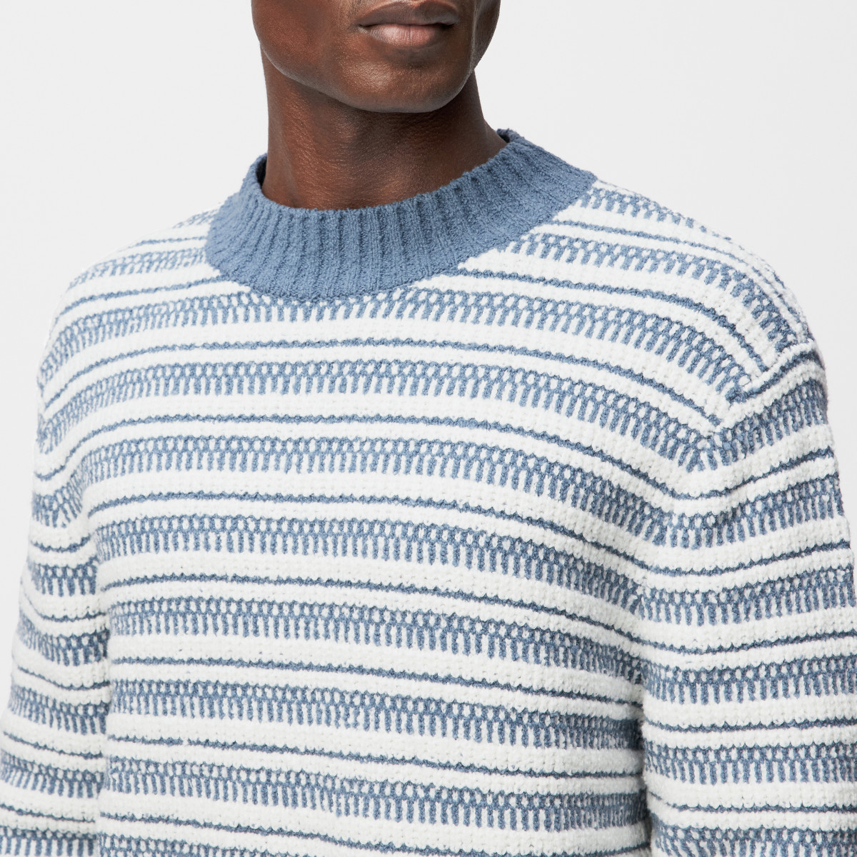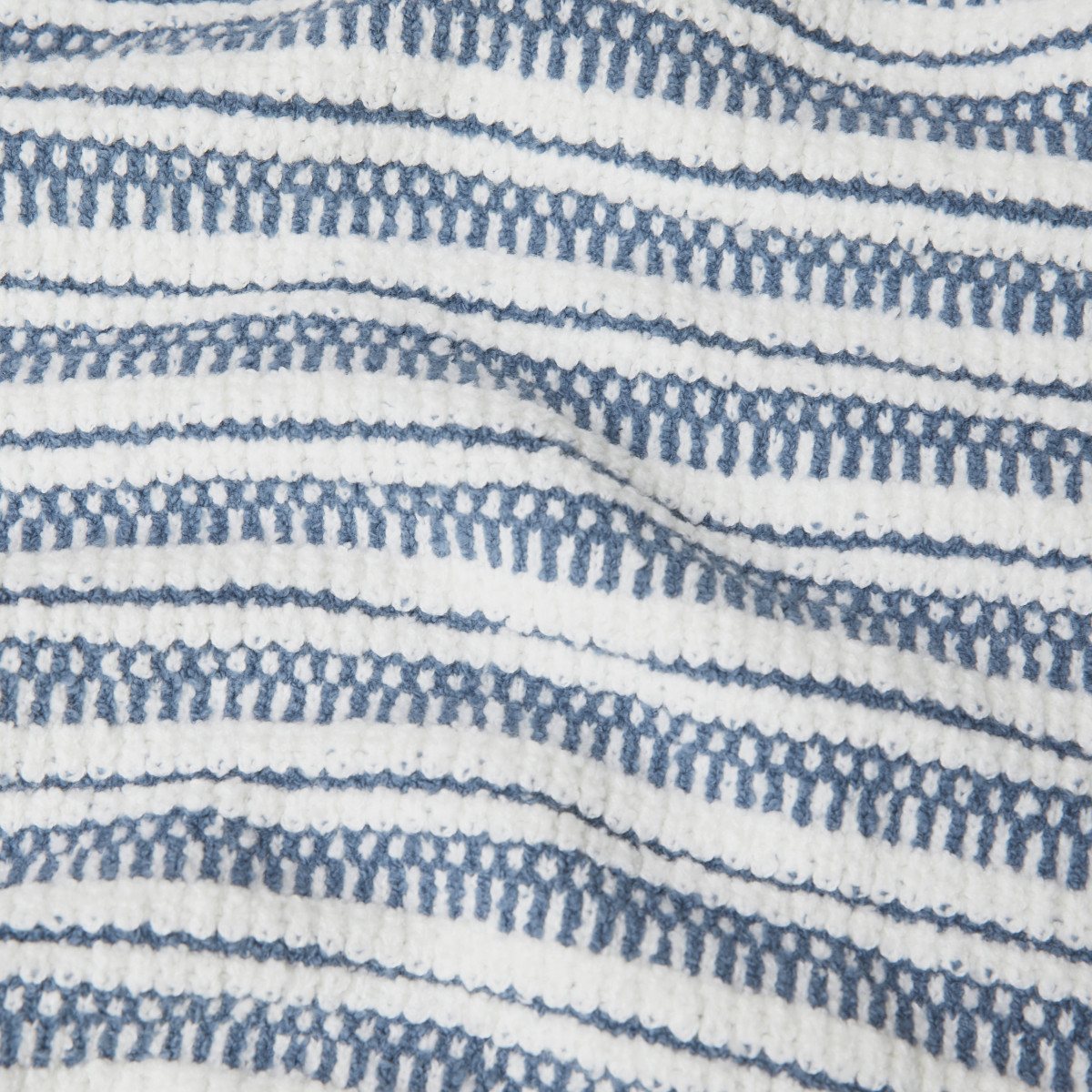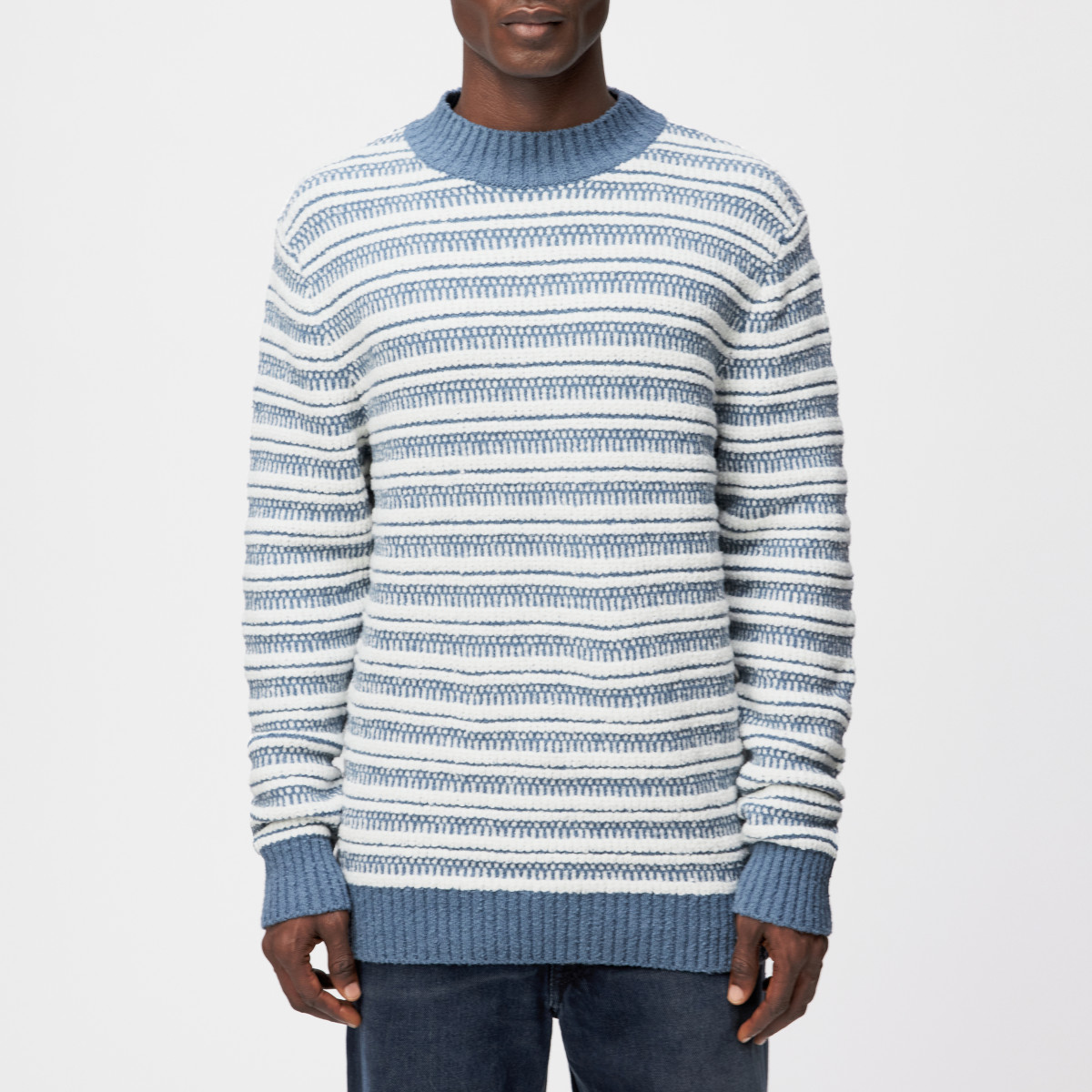 Der gestreifte Strickpullover in harmonischem Blau-Weiß verleiht Ihrem Look einen maritimen und zugleich gemütlichen Touch. Das strukturierte Strickmuster mit feinen Linien und kleinen grafischen Details sorgt für optische Tiefe und eine hochwertige Ausstrahlung. Die gerippten Bündchen an Saum, Ärmeln und Kragen verleihen dem Pullover eine perfekte Passform und halten angenehm warm.