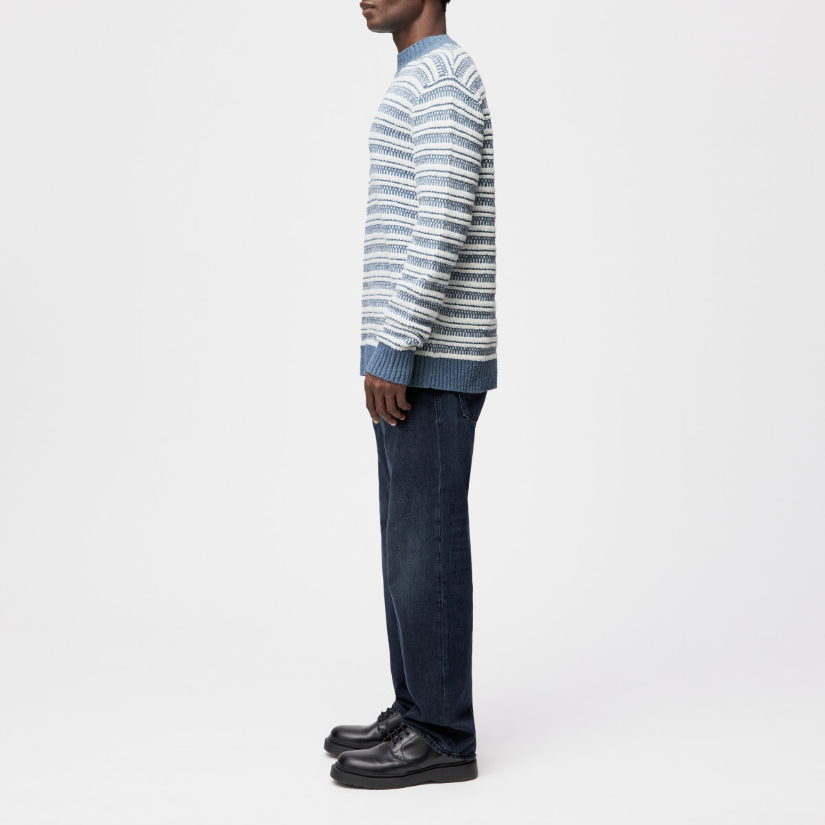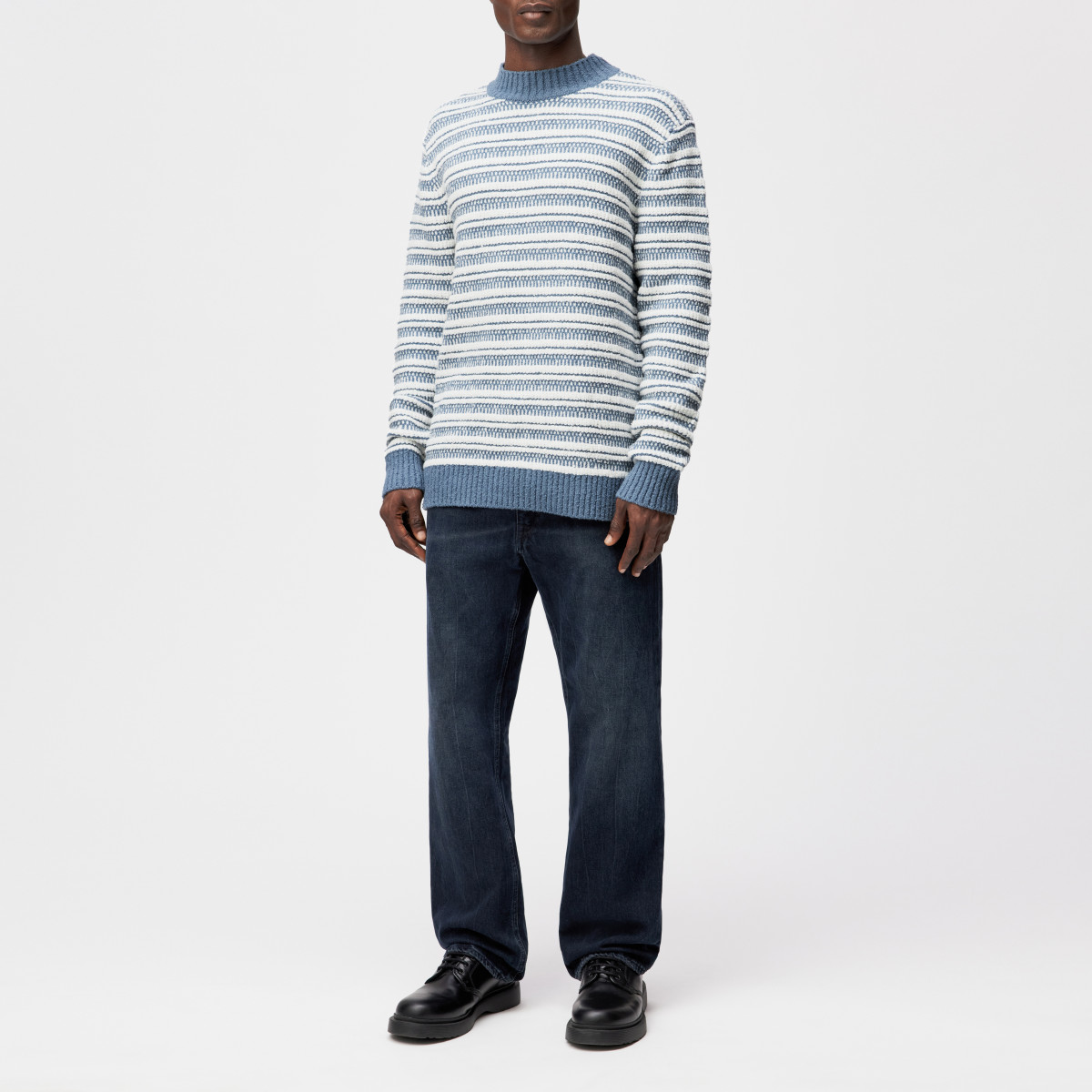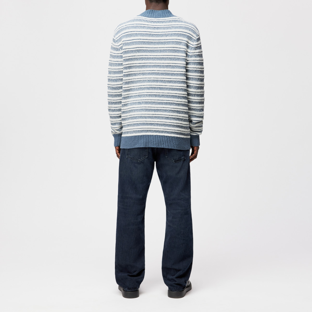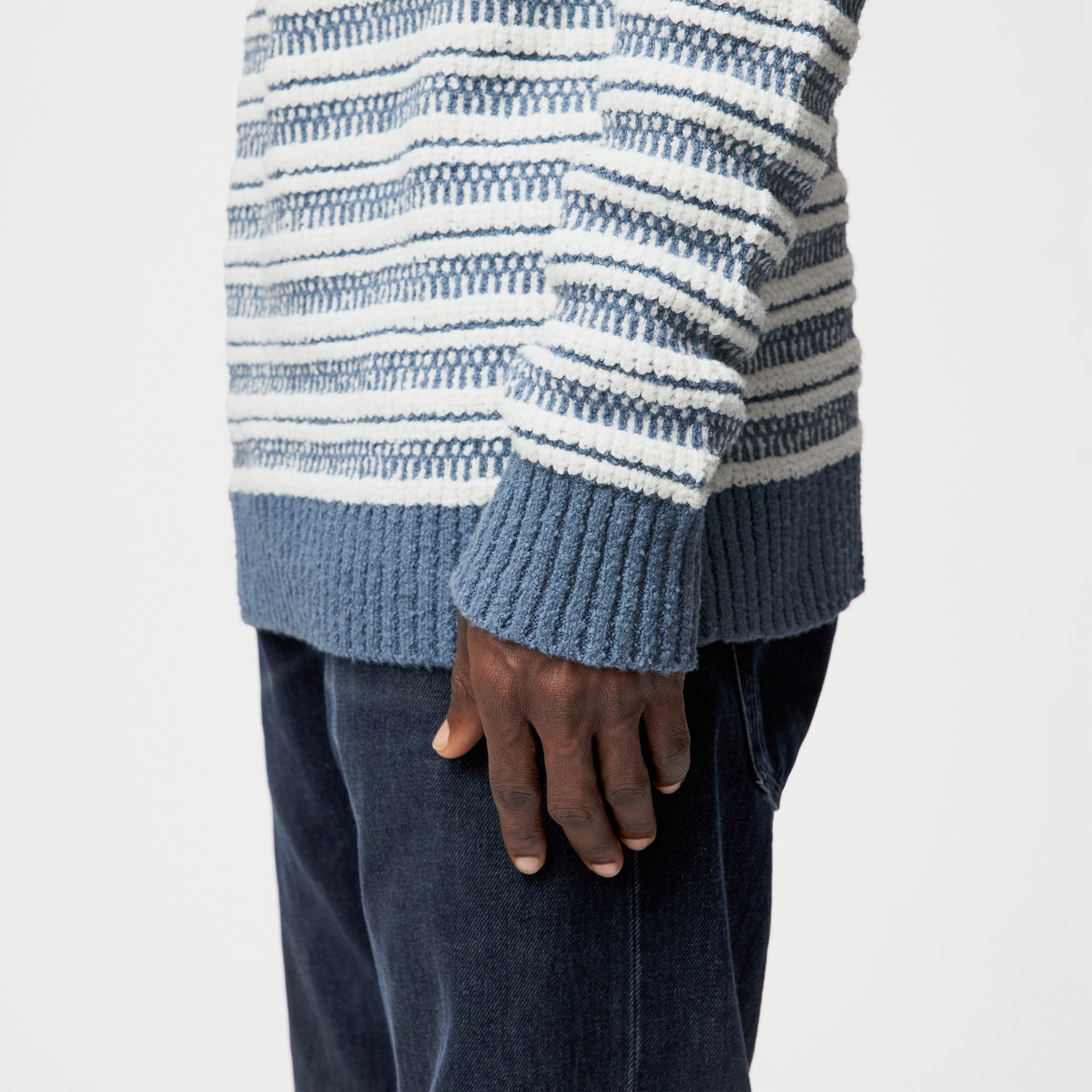 Der gestreifte Strickpullover in harmonischem Blau-Weiß verleiht Ihrem Look einen maritimen und zugleich gemütlichen Touch. Das strukturierte Strickmuster mit feinen Linien und kleinen grafischen Details sorgt für optische Tiefe und eine hochwertige Ausstrahlung. Die gerippten Bündchen an Saum, Ärmeln und Kragen verleihen dem Pullover eine perfekte Passform und halten angenehm warm.