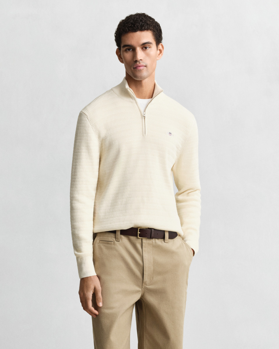 Reißverschlusskragen | Mini-Zopfstrickmuster | Grafische Gant-Stickerei auf der Brust | Mit ähnlichen Farben waschen. Auf links waschen und bügeln. Feucht in Form ziehen.