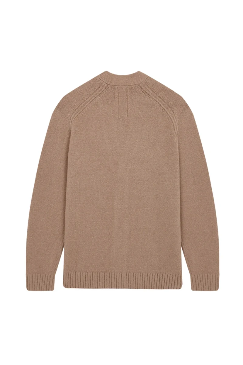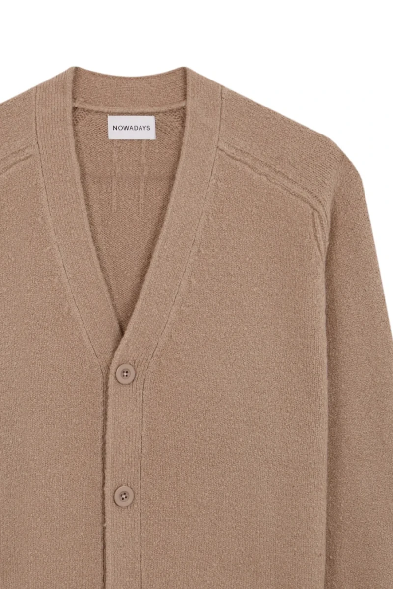 Dieser Cardigan ist aus einem Bouclé-Baumwollstrick gefertigt, der einen sehr weichen und kuscheligen Griff hat. Er ist in einer regulären Passform designt und verfügt über Raglanärmel, einen V-Ausschnitt mit Knopfleiste sowie Rippbündchen am Saum und an den Ärmelabschlüssen.