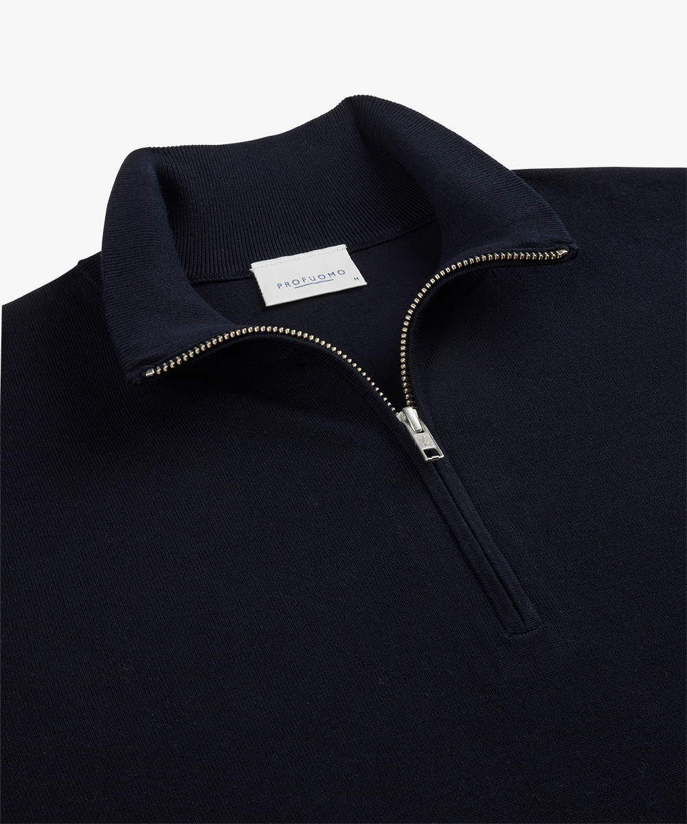 Leichter Herren‑Half‑Zip in Navy mit modernem Schnitt. Collarkragen mit Reißverschluss, elastische Bündchen – ideal für stilvolle Lagenlooks. Der feine Mix aus Lyocell, Baumwolle, Polyamid und Seide verleiht Komfort, atmungsaktive Leichtigkeit und einen edlen Touch.