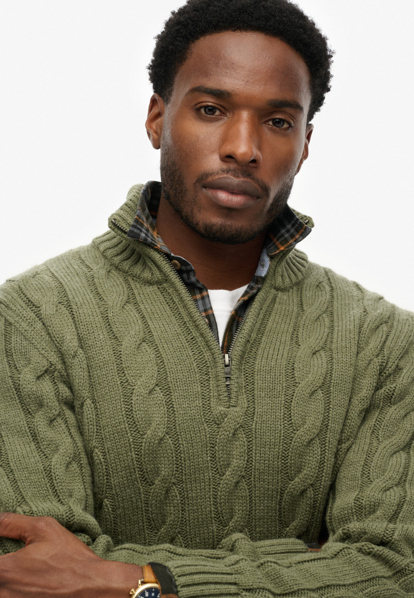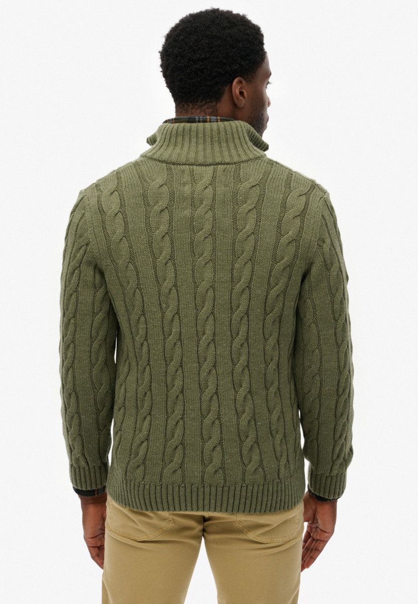 Schmale Passform | Stehkragen | Halber Reißverschluss | Gerippte Bündchen und Saum | Zopfstrickmuster | Metallenes Logo-Emblem | Woll-Mix