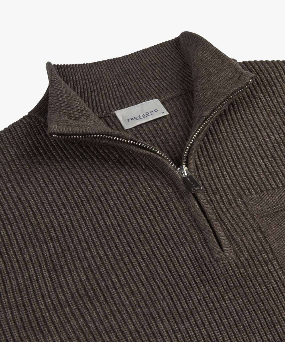Der halbe Reißverschluss-Pullover von Profuomo vereint sportlichen Komfort mit zeitloser Eleganz. Hergestellt aus hochwertiger Merinowolle-Mischung überzeugt dieser Pullover in dunklem Braunton durch seine strukturierte Ripp-Optik, den halbhohen Kragen mit Reißverschluss sowie eine praktische Brusttasche für dezente Details.