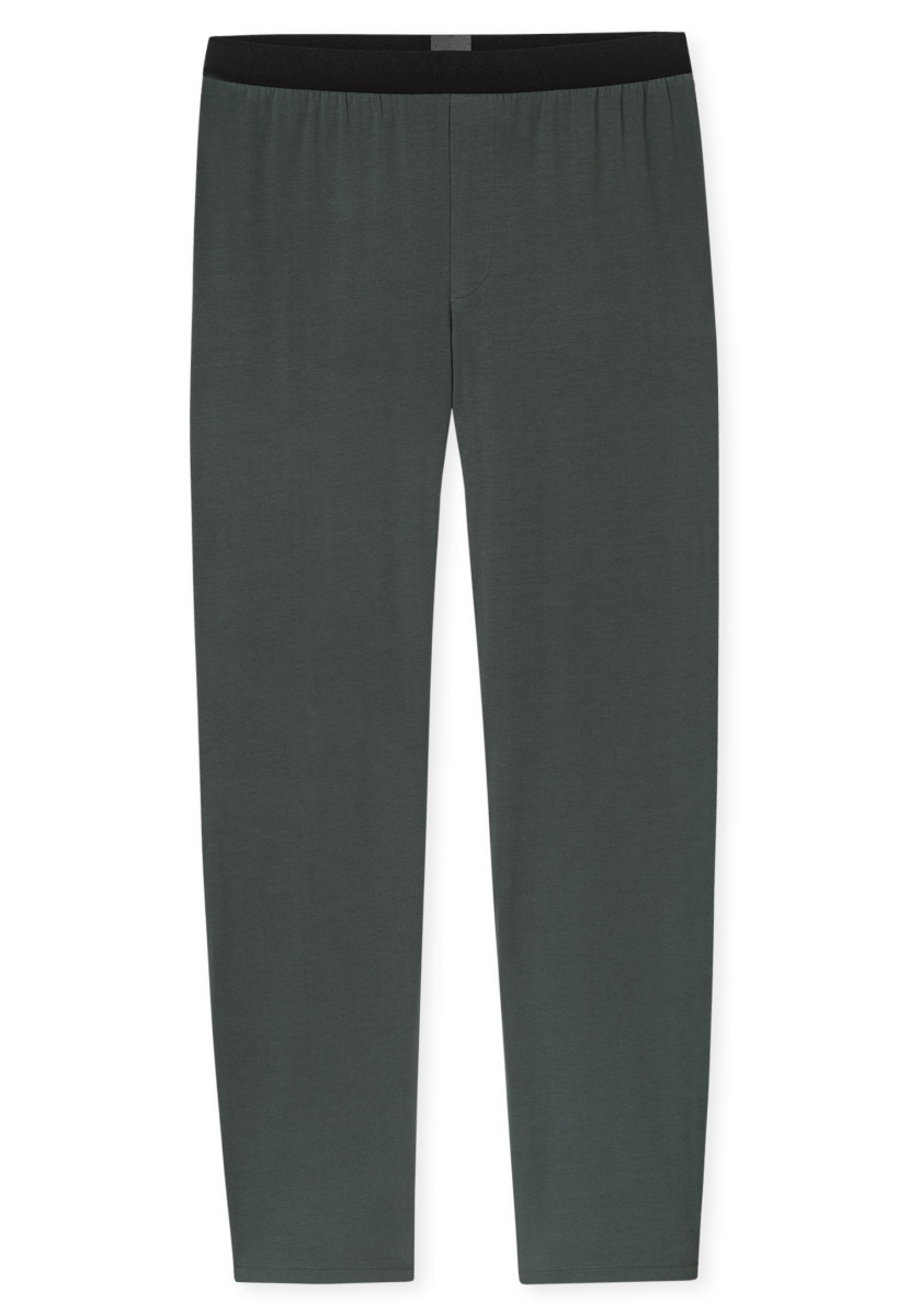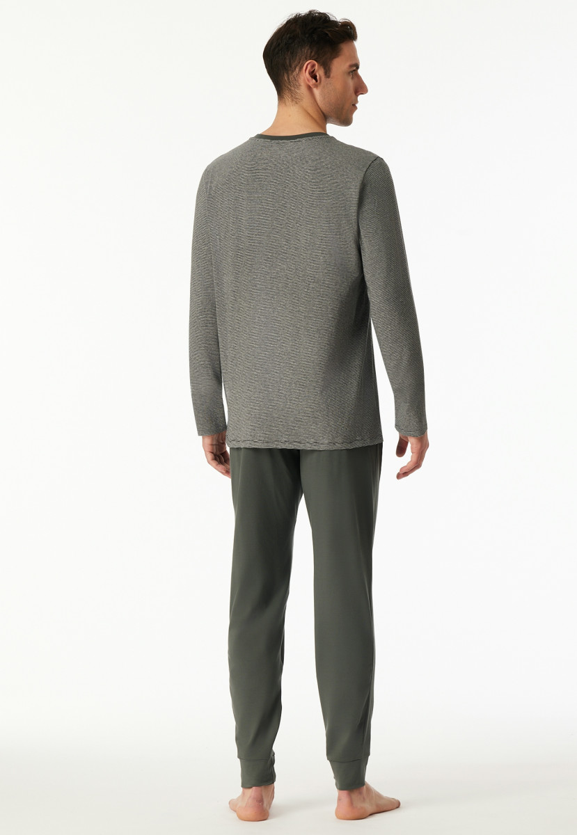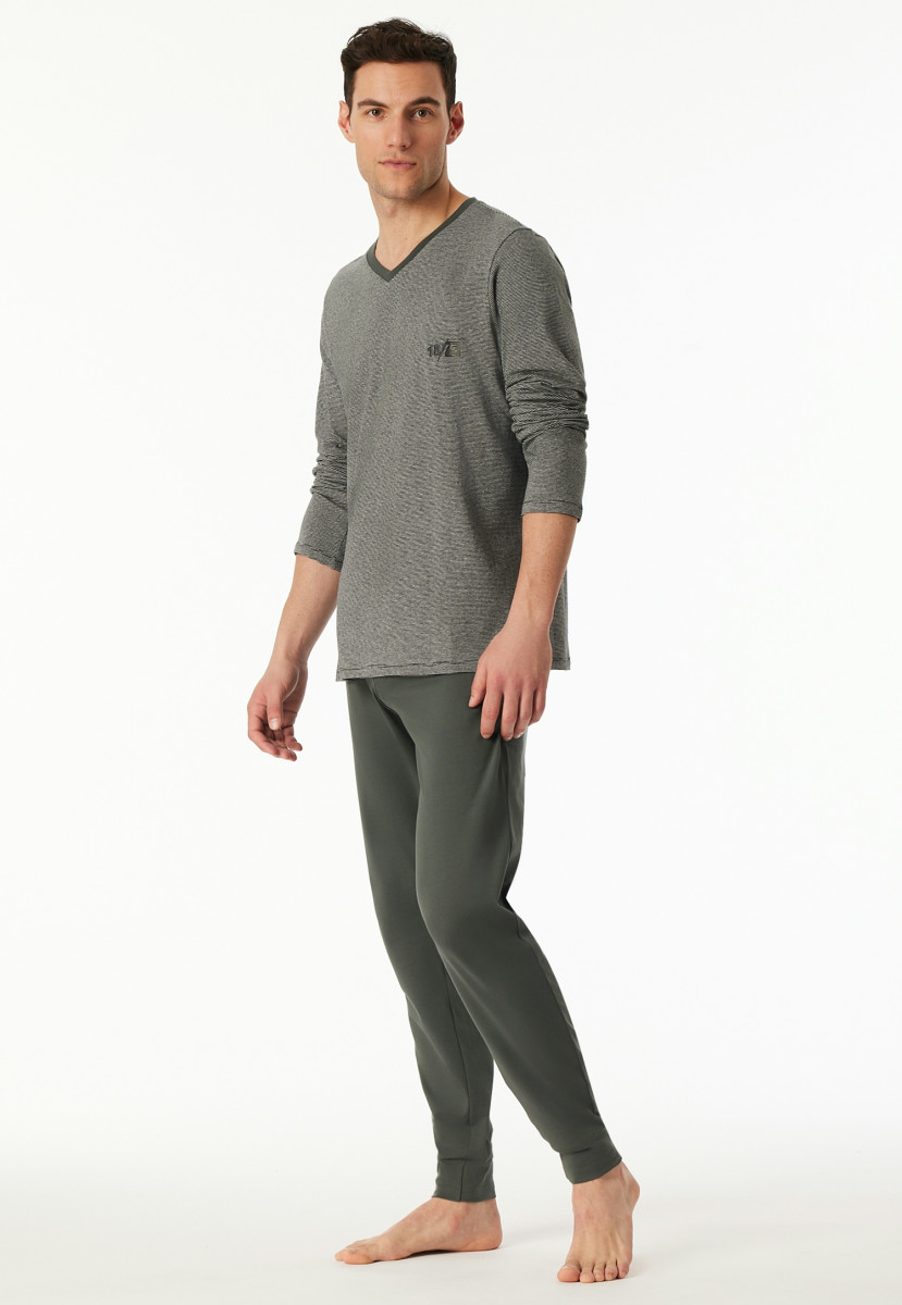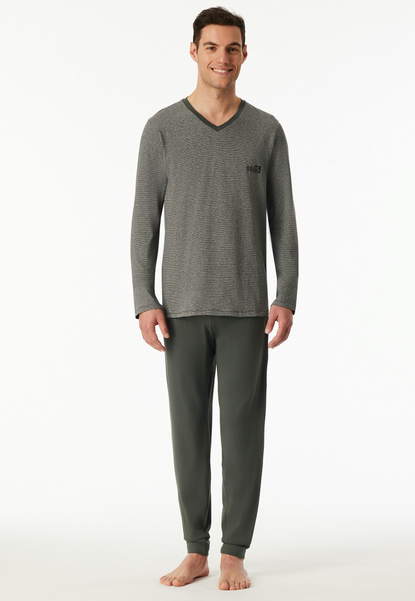 Langer, dunkelgrüner Herrenschlafanzug | Aus der beliebten SCHIESSER Serie "95/5" | Shirt mit V-Ausschnitt und 1875-Print auf der Brust | Hose mit kontrastfarbenem Webgummibund und SCHIESSER-Schriftzug, Beinabschlüsse mit Bündchen | Moderne, lässige Passform und sehr elastisches Material für mehr Bewegungsfreiheit | in weicher, elastischer Single-Jersey-Qualität mit bester Bio-Baumwolle | In weicher, elastischer Single-Jersey-Qualität mit bester Bio-Baumwolle