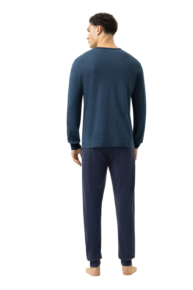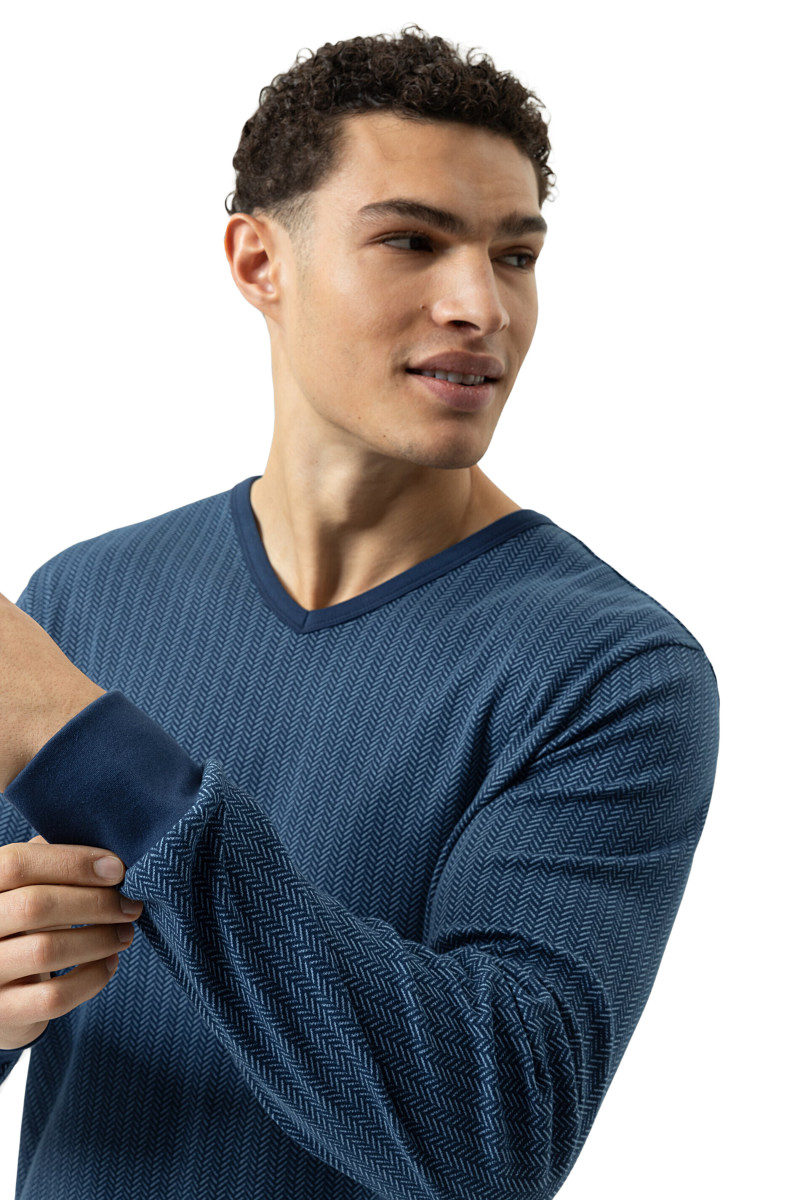 2-teiliger Schlafanzug | Legere Passform | V-Neck | Langarm-Shirt mit klassischem Fischgrätmuster | Mit Brusttasche | Lange unifarbene Hose | Komfortbund | Wärmende Qualität | Reine Baumwolle | Kuschel-Interlock mit angerauter Innenseite | Hoher Tragekomfort