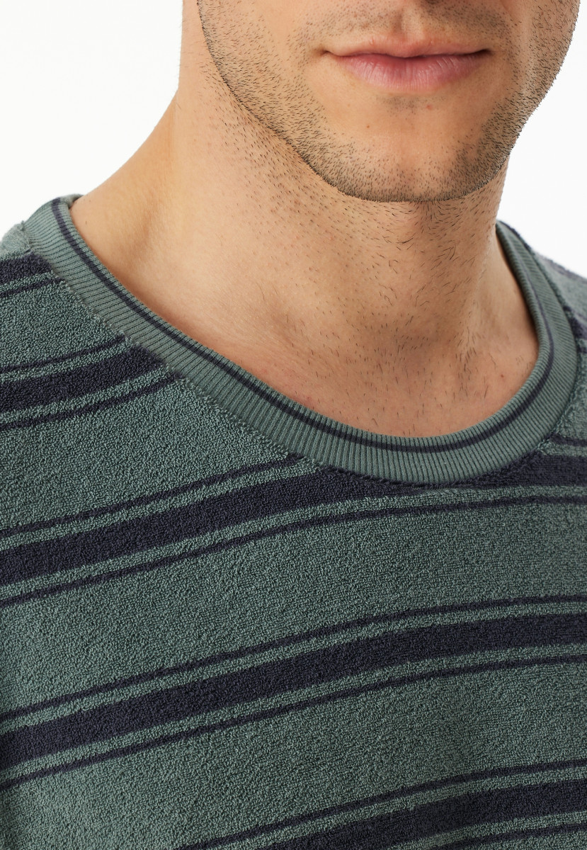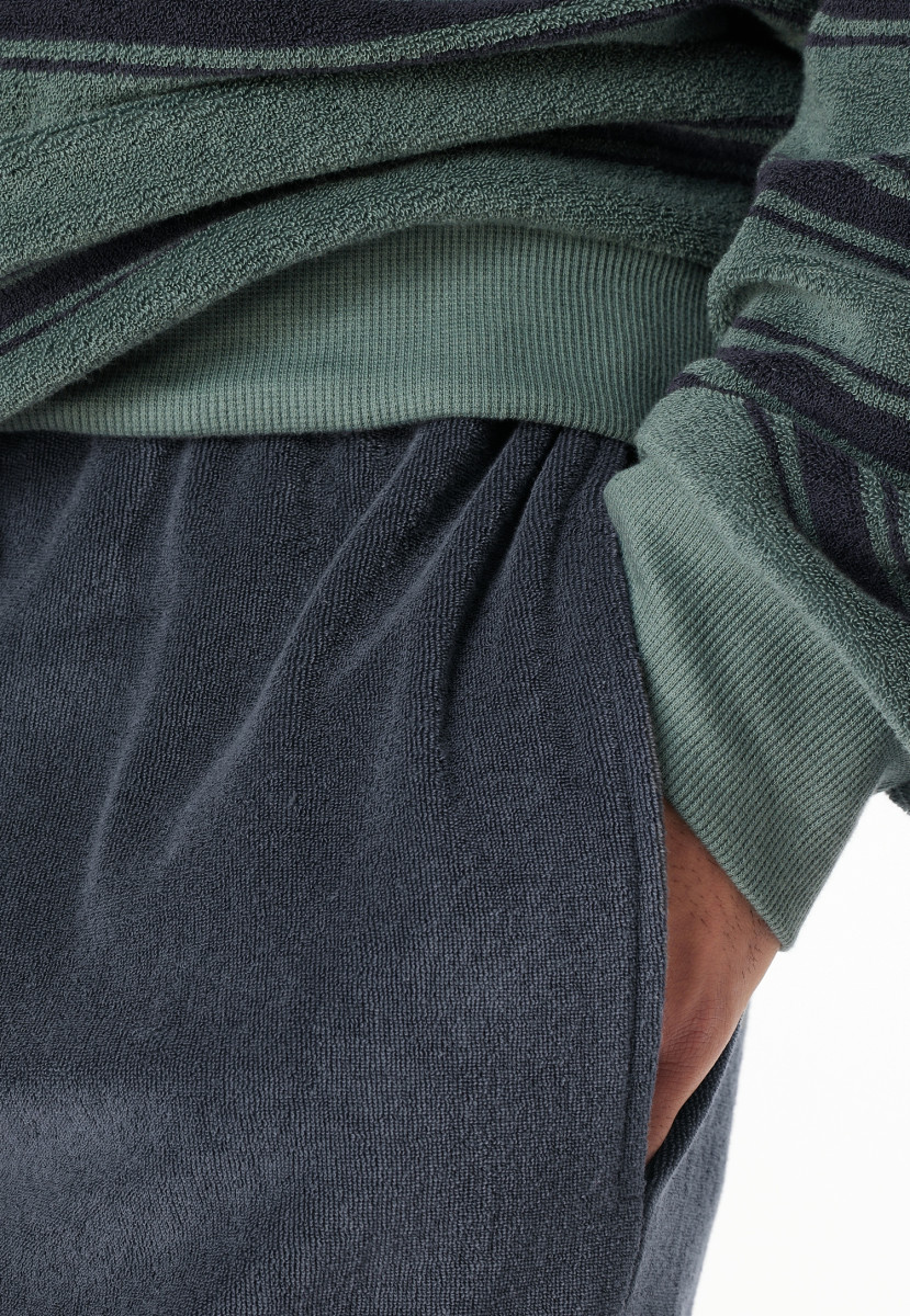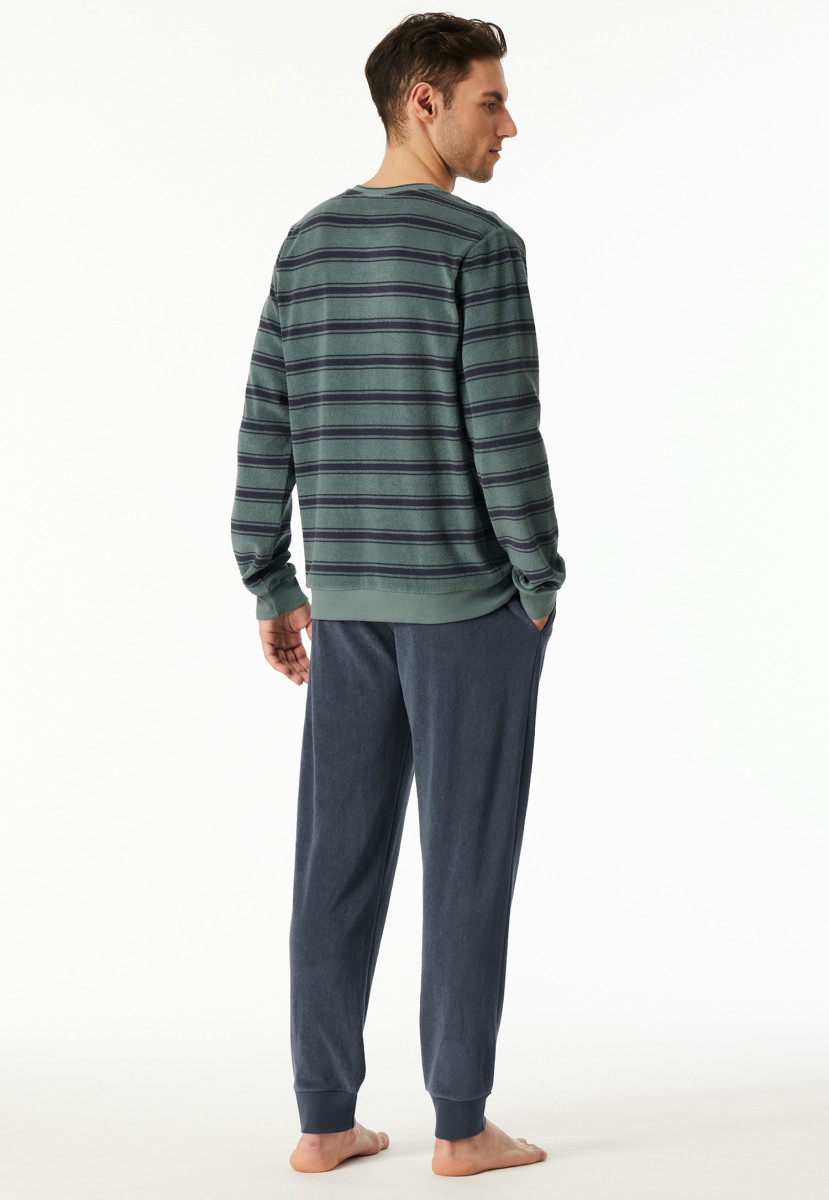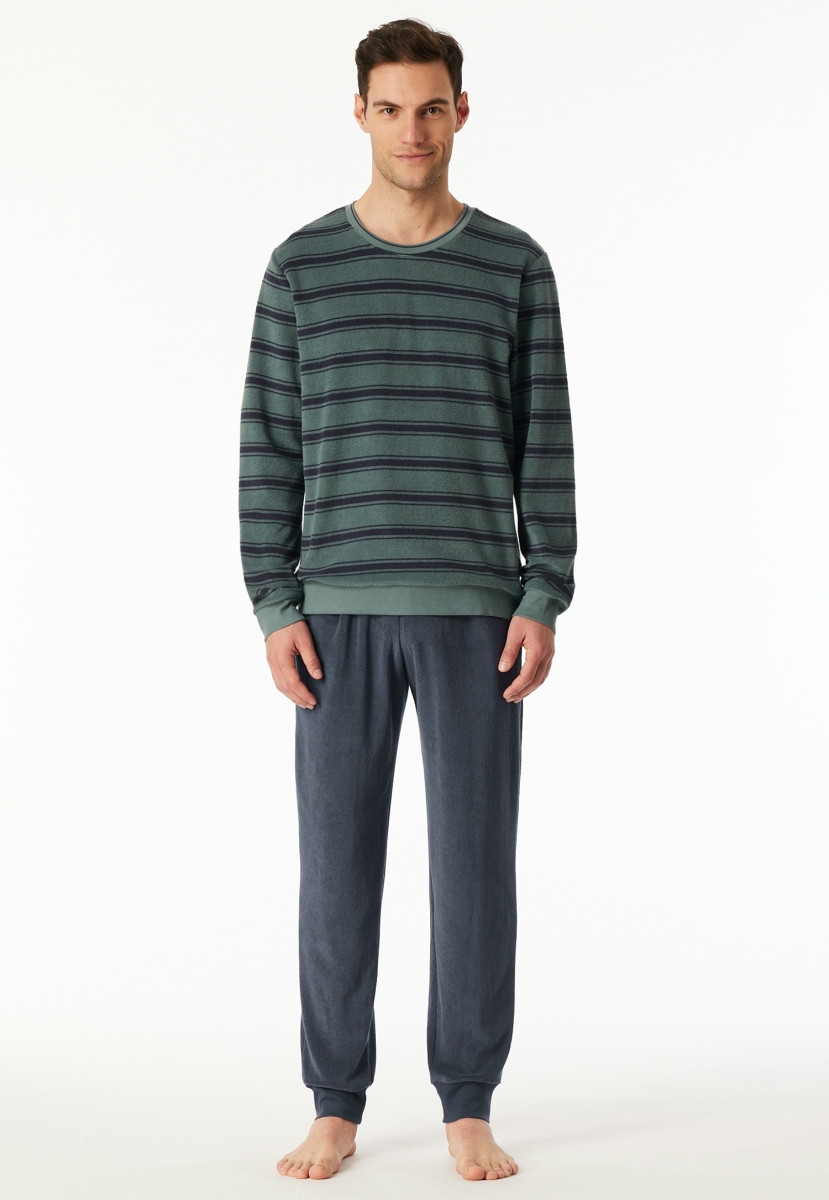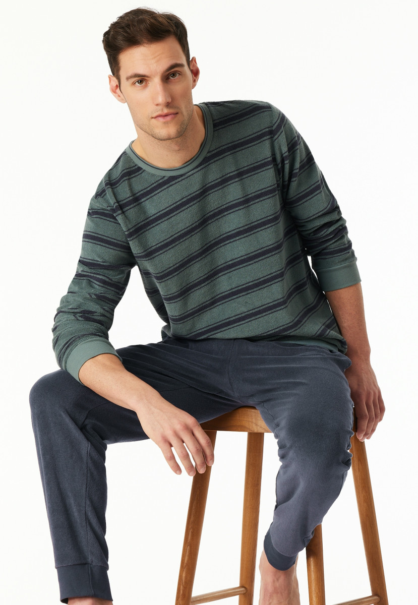 Aus der SCHIESSER Serie "Casual Nightwear" | Shirt mit Ringeln und rundem Halsausschnitt | Hose mit kontrastfarbenem Bindeband am Bund und seitlichen Taschen | Bequeme Doppelripp-Bündchen an den Beinabschlüssen | In wärmender Frottee-Qualität