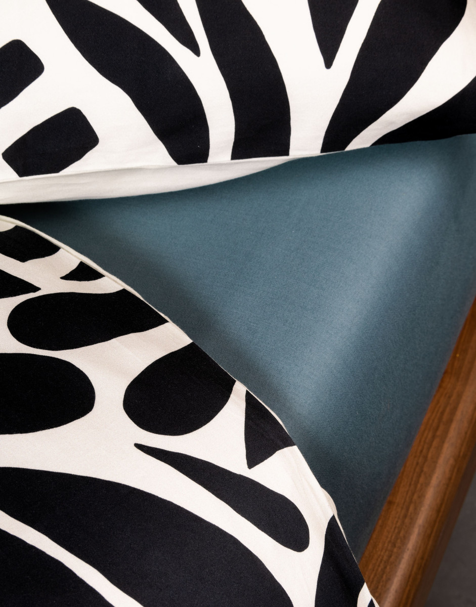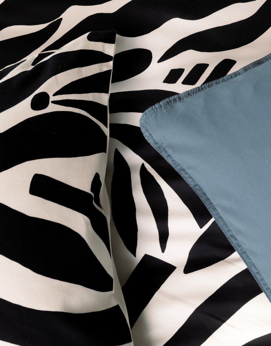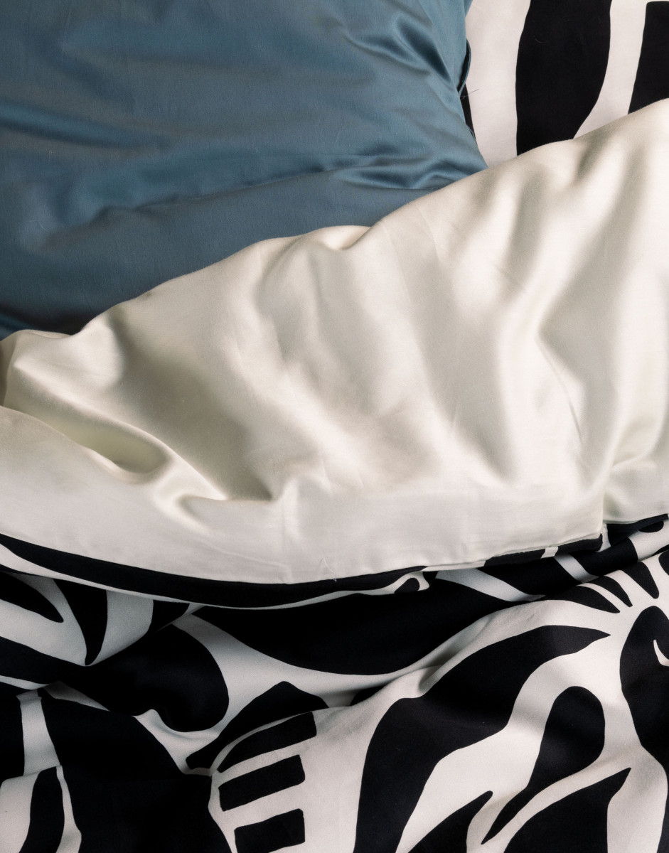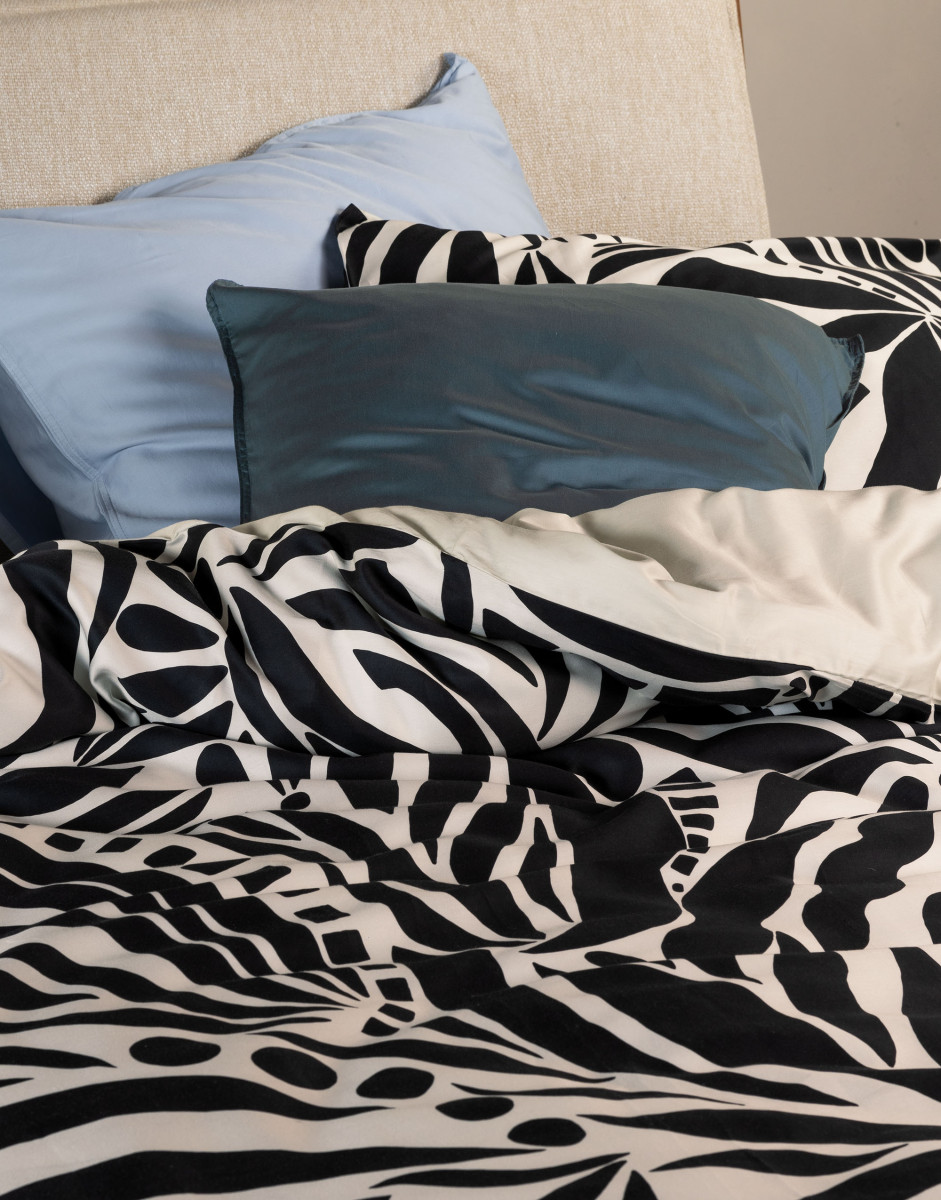 Die wendbare Decke bietet dabei zusätzliche Flexibilität im Design: Während die eine Seite das kontrastreiche Muster trägt, präsentiert sich die Oberseite in einem unifarbenen, beruhigenden Beigeton (oder Cremeton). So können Sie das Ambiente in Ihrem Schlafbereich je nach Stimmung im Handumdrehen verändern. Die Kissenbezüge führen das auffällige Muster fort und runden das elegante Gesamtbild ab.