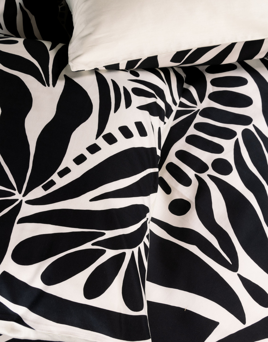 Verleihen Sie Ihrem Schlafzimmer mit dieser luxuriösen Bettwäsche eine stilvolle und zugleich beruhigende Atmosphäre. Das aufregende, zeitlose Dschungelmuster oder Blätterdesign in tiefem Schwarz und sanftem Beige (oder Cremeweiß) macht dieses Set zu einem echten Blickfang. Gefertigt aus hochwertigem, hautfreundlichem Material – idealerweise Baumwolle oder Mako-Satin – garantiert diese Garnitur höchsten Schlafkomfort das ganze Jahr über.
