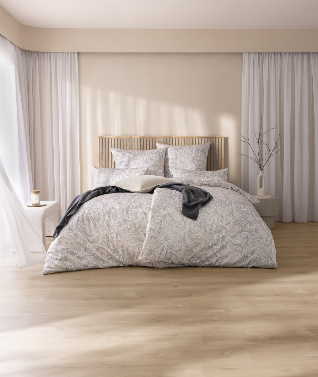 Die Schweizer Premium-Satin-Bettwäsche Birgit in der Farbe Puder vereint klassische Eleganz mit modernem Understatement. Ihr filigranes Paisley-Muster in sanften Puder- und Fliedertönen verleiht deinem Schlafzimmer ein harmonisches, stilvolles Ambiente – luxuriös und doch wunderbar beruhigend.