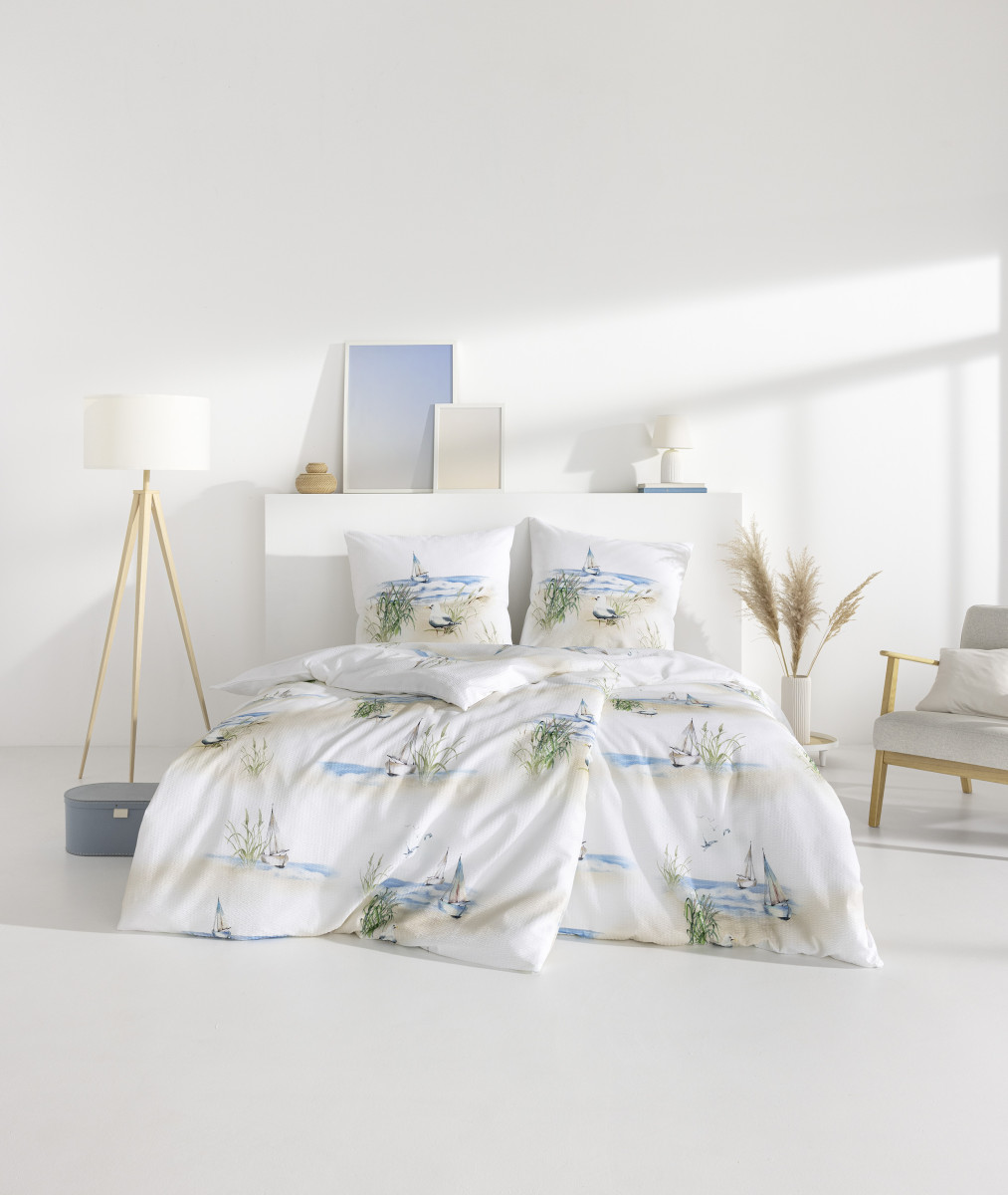 Maritimes Design mit Segelbooten, Wellen und Uferlandschaften auf leinenfarbener Basis – für frisches Küstenflair im Schlafzimmer. Seersucker aus atmungsaktiver Baumwolle ist ideal für warme Nächte: luftdurchlässig, pflegeleicht und schnelltrocknend.