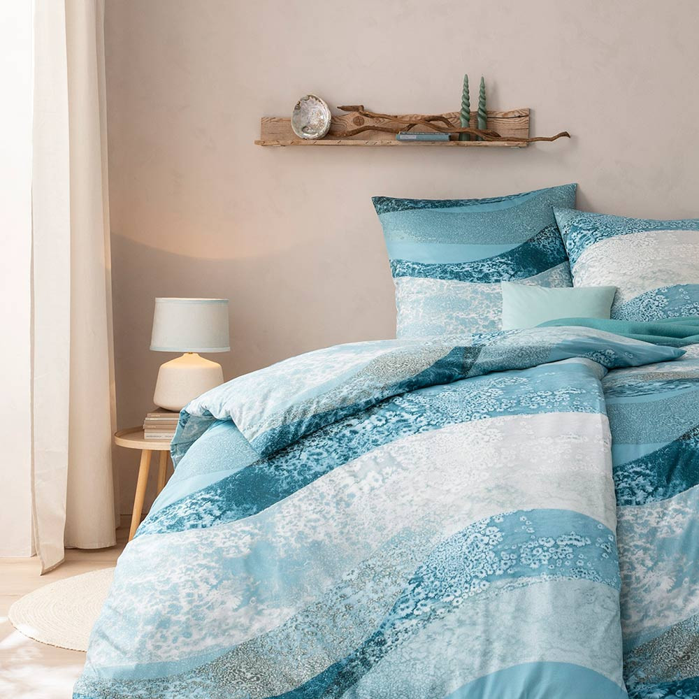 Lebendig und erfrischend kommen die Kissen- und Bettdeckenbezüge der Garnitur Rio daher. Weiche Wellen in Cyan und Weiß, die von filigranen Musterakzenten durchzogen sind, erzeugen ein Gefühl der Ruhe und Leichtigkeit. Mit passenden Kissen in Tiefblau oder Creme wird dein Bett zum neuen Blickfang in deinem Heim, der zum Träumen und Verweilen einlädt.