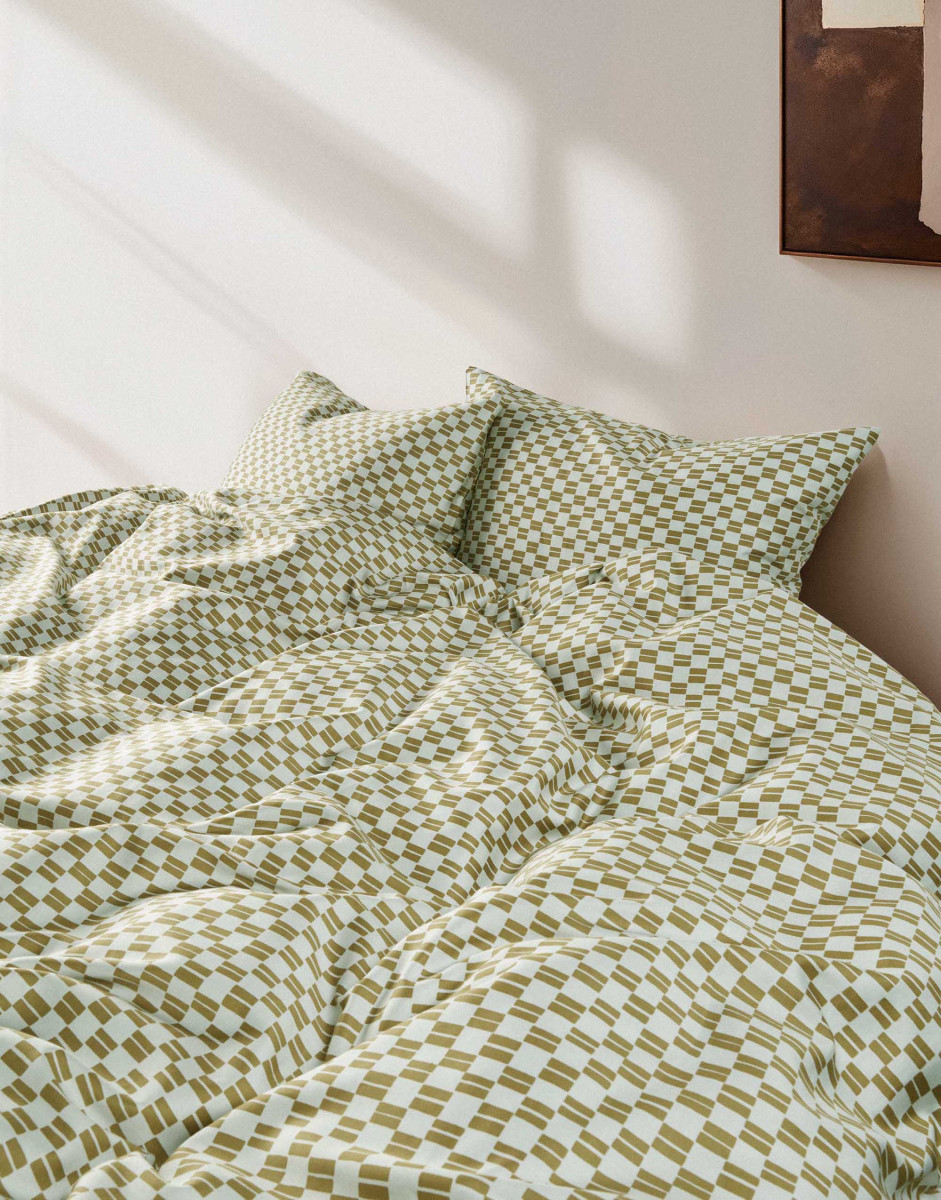 Kleinkariert mit großer Wirkung. Zeitlose Karos in dezenten Blaunuancen erzeugen durch ihre organische Linienführung einen lebendigen Minimalismus, der durch eine subtil glänzende Oberfläche zum Ausdruck kommt. Der GOTS-zertifizierte Bio-Baumwollsatin liegt angenehm weich auf der Haut und vereint die atmungsaktiven und feuchtigkeitsabsorbierenden Eigenschaften von Bio-Baumwolle mit der seidigen Optik von Satin.