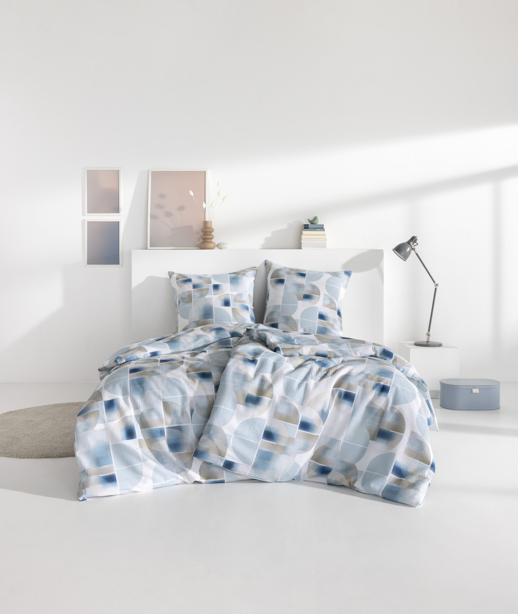 Modernes Design in Blau- und Beigetönen mit geometrischem Muster – ideal für minimalistisch eingerichtete Schlafzimmer. Die Seersucker-Qualität ist atmungsaktiv, temperaturausgleichend und sorgt durch ihre Struktur für optimale Luftzirkulation – perfekt für warme Nächte.