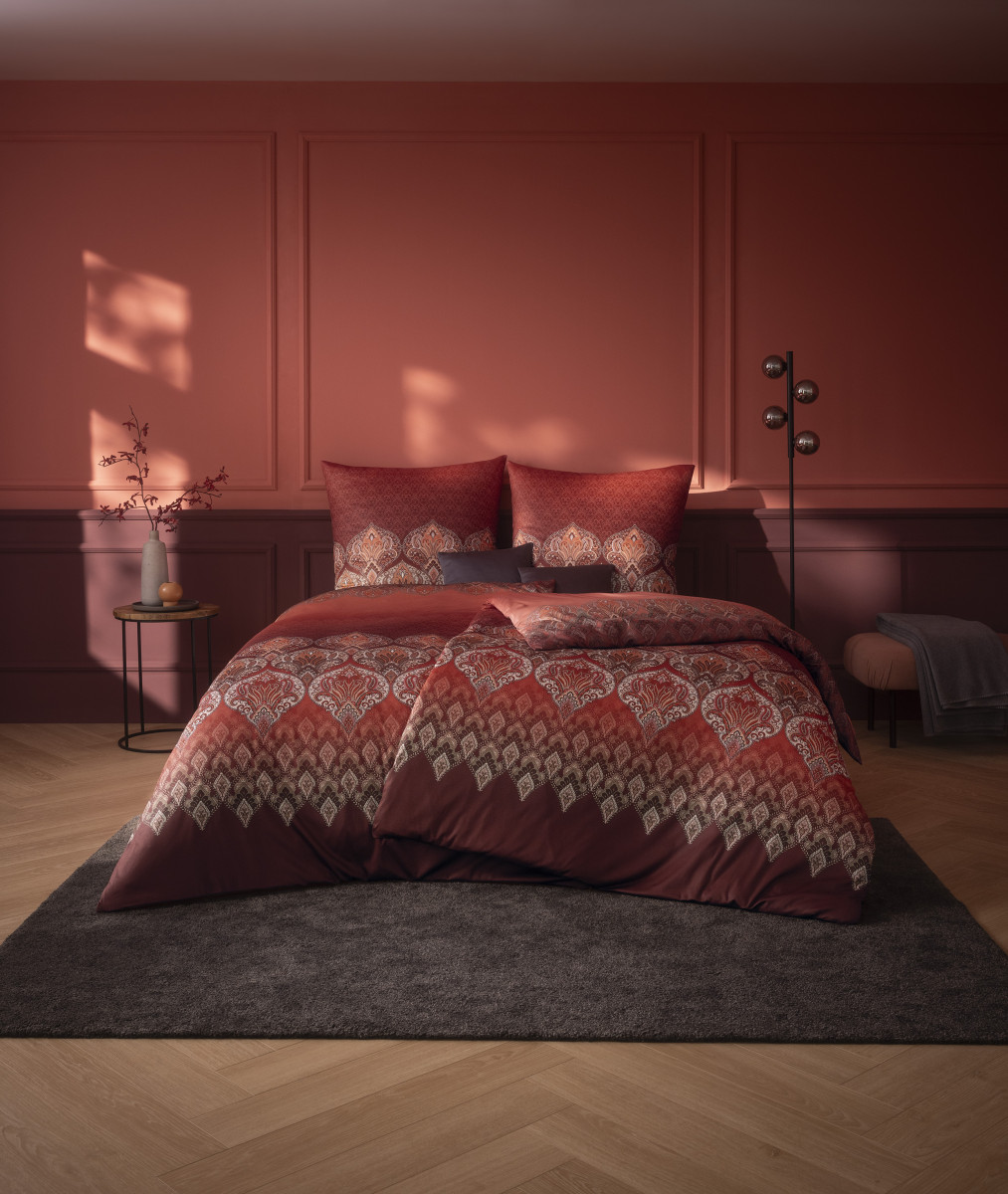 Die Bettwäsche Sophia Burgundy von Estella besteht aus Mako-Interlock-Jersey aus 100 % Baumwolle. Das orientalische Ornamentmuster in Burgund-, Rot- und Beigetönen schafft eine warme, opulente Atmosphäre. Sie ist ganzjahrestauglich, temperaturausgleichend, pflegeleicht, bügelfrei und formstabil – ideal für stilvolle und komfortable Schlafzimmer.
