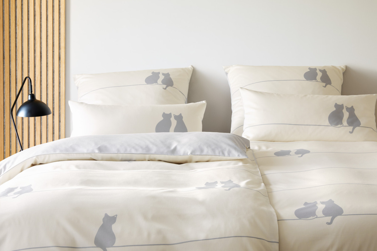 You & Me zeigt die Katzen im Duo und als Solisten - formschön vereinfacht auf wesentliche Details. Die Wende-Bettwäsche You & Me mit unihafter Rückseite ist gefertigt aus feinem Comfort Satin aus 100% Baumwolle, pflegleicht und ausgerüstet nach Ökotex Standard 100. Diese schließt mit einem hochwertigen Reißverschluss.