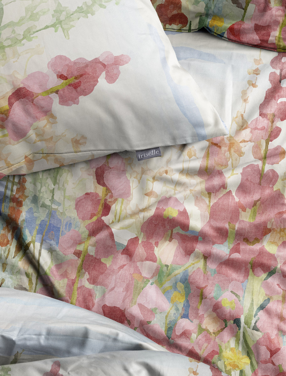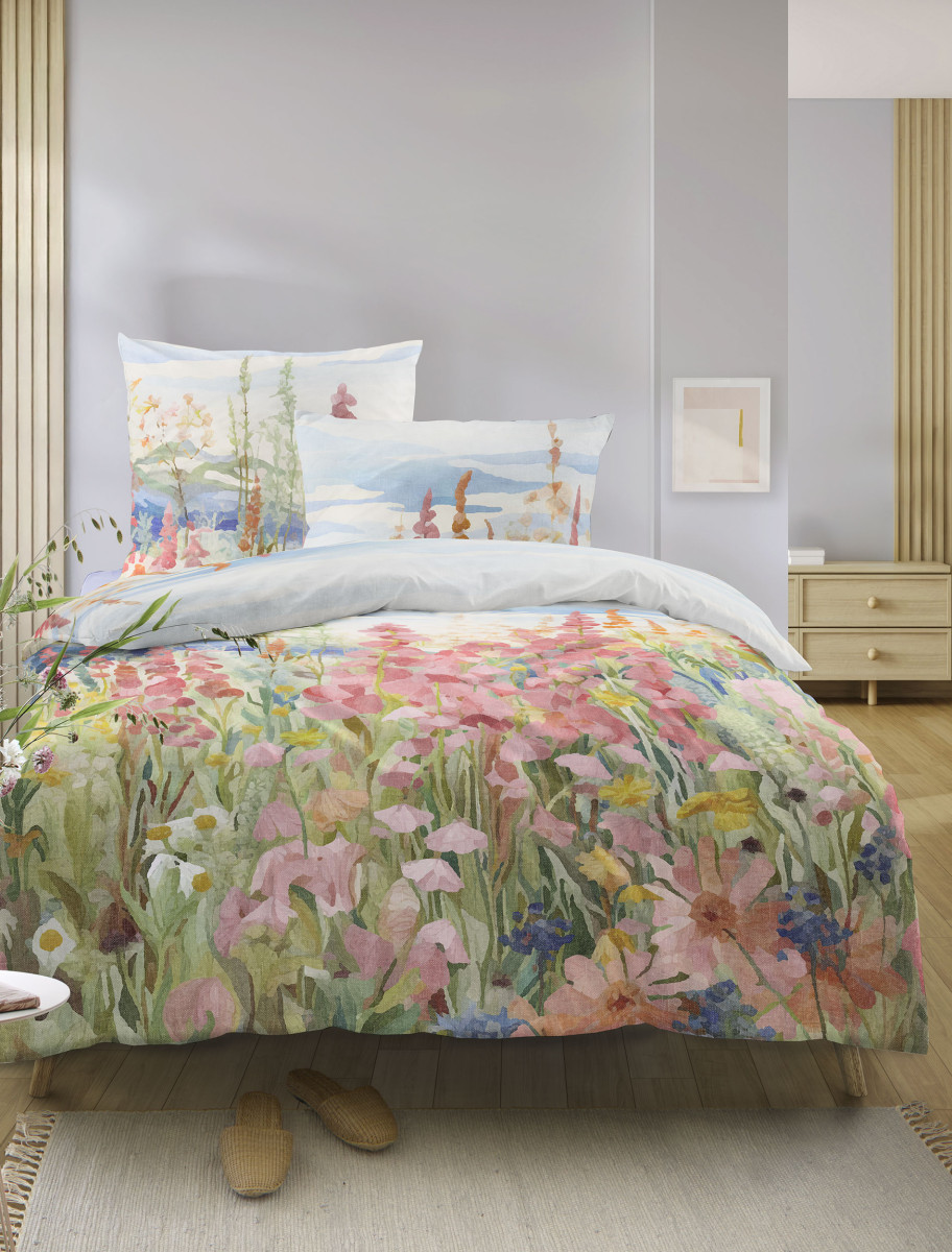 Irisette Mako-Satin Bettwäsche Wave 8689 in Multi. Zauberhafte Aquarell-Wiesenblumen verzaubern den Grund mit sanften Farbverläufen. Feinster Mako-Satin sorgt für glatten Griff, glänzende Oberfläche und exzellenten Fall. Hautsympathisch, langlebig und pflegeleicht – ideal für einen eleganten, frühlingshaften Schlafraum.