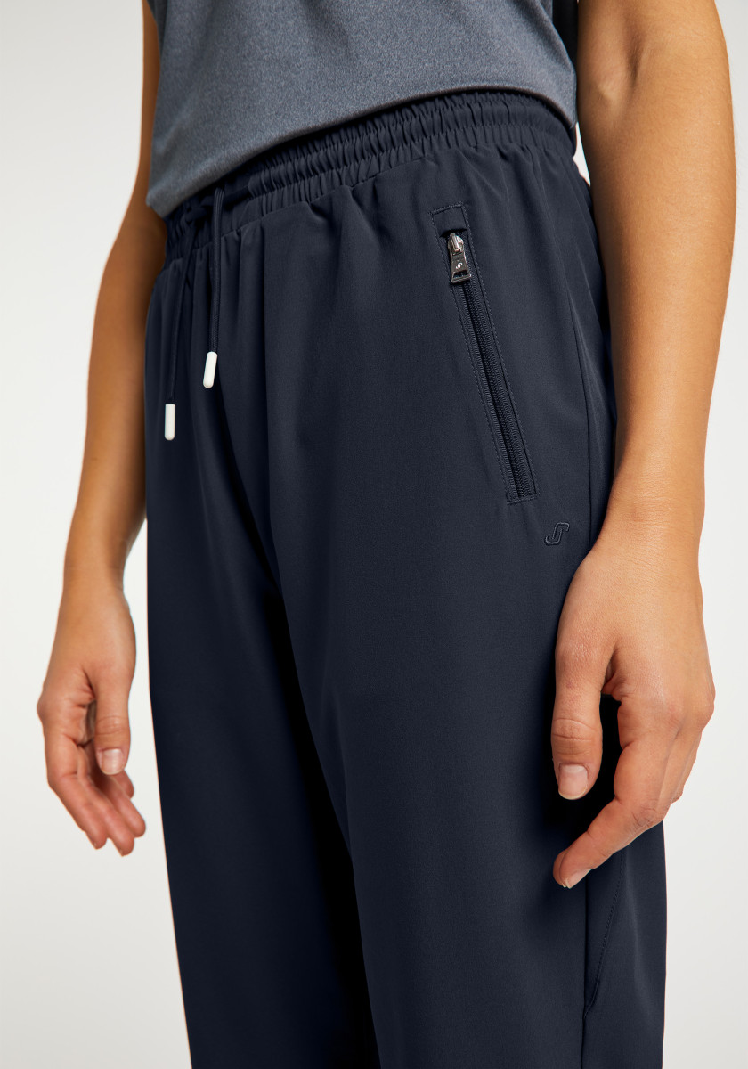 Die 7/8-Sporthose für Damen besticht durch ihr ansprechendes Design und herrlich bequemes Material. Der Beinschlitz ist mit einem glänzenden Gummiband eingefasst und sorgt für den Hingucker, wenn Sie die sportliche Hose zum nächsten Kurs im Fitnessstudio tragen. Auch bei Sportarten wie Yoga sorgt die Sport-Caprihose für Damen für ausreichend Unterstützung. Dank der Materialmischung aus 92 % Polyester und 8 % Elasthan haben Sie genügend Bewegungsfreiheit für schwierige Übungen wie die Kobra oder den Krieger. Trainingshose aus pflegeleichtem Material. Nicht nur für schweißtreibende Aktivitäten ist die Sport-Caprihose für Damen ELLIE der ideale Begleiter, auch als Freizeithose macht sie eine gute Figur. Sie besteht aus leichtem Webmaterial mit Elasthan, was schnelltrocknend sowie pflegeleicht ist und für einen angenehmen Tragekomfort sorgt. Durch den Komfortbund mit außenliegender Kordel können Sie die Hose so schnüren, dass Sie bequem sitzt. In den zwei Eingrifftaschen mit Reißverschluss können Sie Kleinigkeiten und wichtige Habseligkeiten gut verstauen. Entdecken Sie jetzt Ihre neue Lieblingshose für Sport und Freizeit: Die Trainingshose für Damen ELLIE!