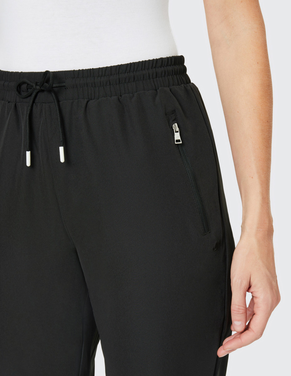 Die 7/8-Sporthose für Damen besticht durch ihr ansprechendes Design und herrlich bequemes Material. Der Beinschlitz ist mit einem glänzenden Gummiband eingefasst und sorgt für den Hingucker, wenn Sie die sportliche Hose zum nächsten Kurs im Fitnessstudio tragen. Auch bei Sportarten wie Yoga sorgt die Sport-Caprihose für Damen für ausreichend Unterstützung. Dank der Materialmischung aus 92 % Polyester und 8 % Elasthan haben Sie genügend Bewegungsfreiheit für schwierige Übungen wie die Kobra oder den Krieger. Trainingshose aus pflegeleichtem Material. Nicht nur für schweißtreibende Aktivitäten ist die Sport-Caprihose für Damen ELLIE der ideale Begleiter, auch als Freizeithose macht sie eine gute Figur. Sie besteht aus leichtem Webmaterial mit Elasthan, was schnelltrocknend sowie pflegeleicht ist und für einen angenehmen Tragekomfort sorgt. Durch den Komfortbund mit außenliegender Kordel können Sie die Hose so schnüren, dass Sie bequem sitzt. In den zwei Eingrifftaschen mit Reißverschluss können Sie Kleinigkeiten und wichtige Habseligkeiten gut verstauen. Entdecken Sie jetzt Ihre neue Lieblingshose für Sport und Freizeit: Die Trainingshose für Damen ELLIE!