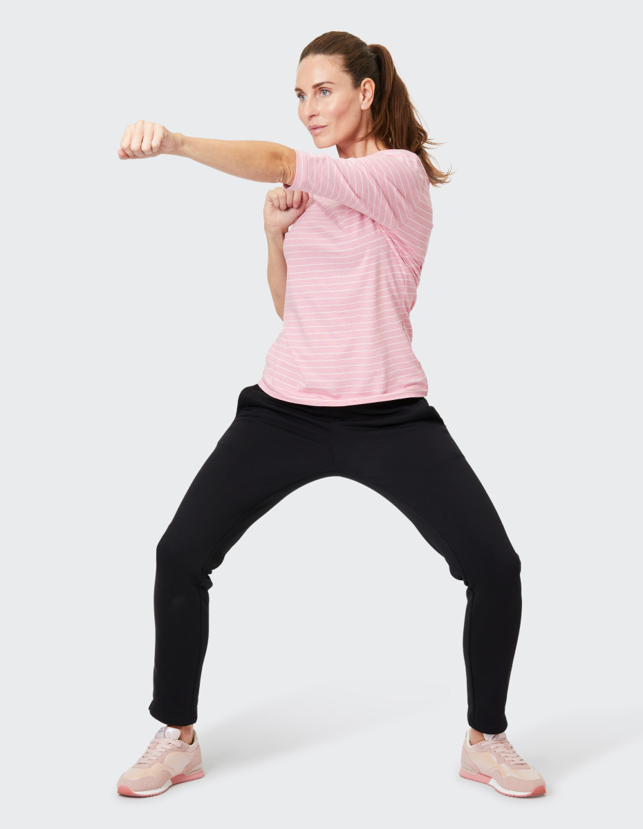 Trainingshose REBECCA für Damen: Online bestellen, anziehen und wohlfühlen. Sie tanzen, joggen oder sporteln gerne im Fitnessstudio? Dann sollten Sie unbedingt einen Blick auf die komfortable Damen-Trainingshose REBECCA von JOY sportswear werfen. Darin werden Drehungen, Sprints oder kräftezehrende Workouts zum Kinderspiel für Sie. Dafür sorgen der weiche Stoff und die bequeme Passform der Sporthose, die sich locker an Ihre Beine schmiegt. Die langen Hosenbeine liegen luftig-leicht an Ihrem Körper an, ohne dabei einzuengen. Ganz im Gegenteil der angenehme Schnitt der REBECCA Trainingshose macht sie für Damen nicht nur zu einer perfekten Fitness-, sondern auch zu einer idealen Freizeithose. Überzeugen Sie sich selbst! Eine sportliche Funktionshose für unterwegs und Zuhause. Die Marke JOY sportswear steht vor allem für eines: Tragekomfort! Damit dieser auf keinen Fall zu kurz kommt, punktet die Trainingshose REBECCA bei Damen mit vielen vorteilhaften Eigenschaften: Optimale Materialzusammensetzung dank atmungsaktiver Baumwollmischung. Unkomplizierte Reinigung aufgrund pflegeleichter Stoffe. Nützliche Eingrifftaschen für Wertsachen wie Autoschlüssel oder Smartphone. Verstellbarer Kordelzugbund für ausreichend Platz an Bauch und Hüften.
