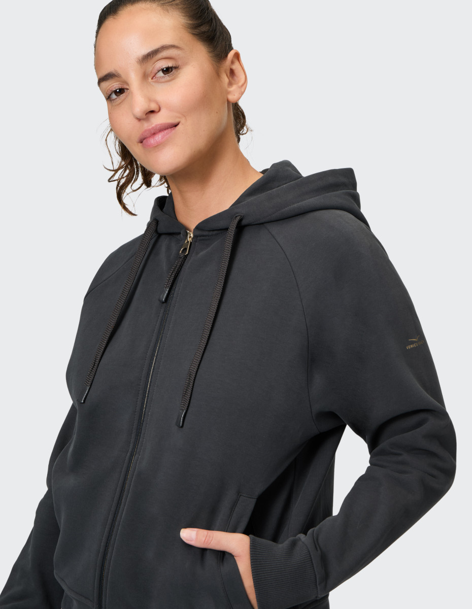 Suchst du nach einer bequemen Jacke, die du bei jeder sportlichen Höchstleistung sowie im Alltag tragen kannst und die deinen aktiven, gesunden Lifestyle unterstreicht? Die Sport-Sweatjacke für Damen mit Kapuze DILLAH von VENICE BEACH verbindet alle Eigenschaften, die du für ein schweißtreibendes Training und einen selbstbewussten Auftritt im Alltag sowie in der Freizeit brauchst. Die lässige Sportswear zeichnet sich durch ein kuschelig weiches Material aus, das sich super angenehm auf der Haut anfühlt. Die optimale Passform ermöglicht dir eine verbesserte Performance für ein Training voller Energie.