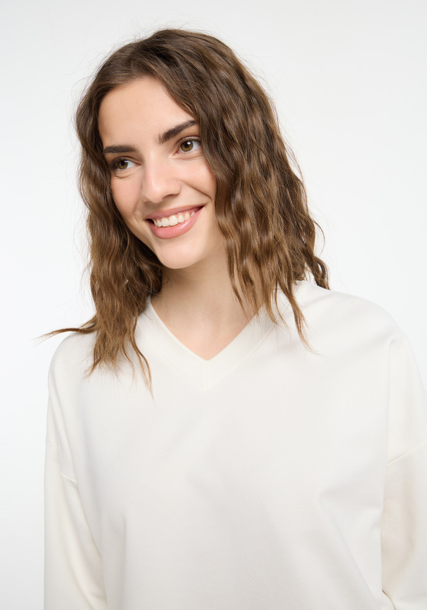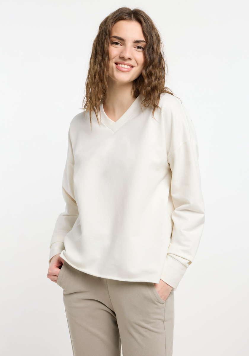 Locker geschnittenes Sweatshirt | Weiche, elastische Sweatqualität | V-Ausschnitt, leicht überschnittene Schulter, Raw-Edge Verarbeitung am Saum, kleine Schlitze an den Seiten | Logo Schriftzug am Rücken in verschiedenen klassischen Sticktechniken | Stylisches Sweatshirt, ideal für einen kühleren Sommerabend