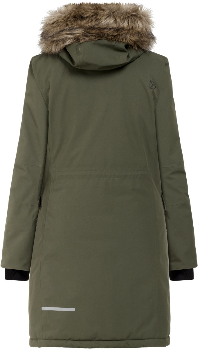 Der Parka verfügt über eine verstellbare Kapuze mit abnehmbarem Kunstpelzbesatz, einen Zwei-Wege-Reißverschluss mit Windschutzleiste und mehrere praktische Taschen, darunter zwei Innentaschen und reflektierende Details für erhöhte Sichtbarkeit. Die Taille ist mit einem inneren Kordelzug verstellbar, und die Ärmelabschlüsse sind elastisch mit Daumenlöchern ausgestattet, um kalte Zugluft fernzuhalten.