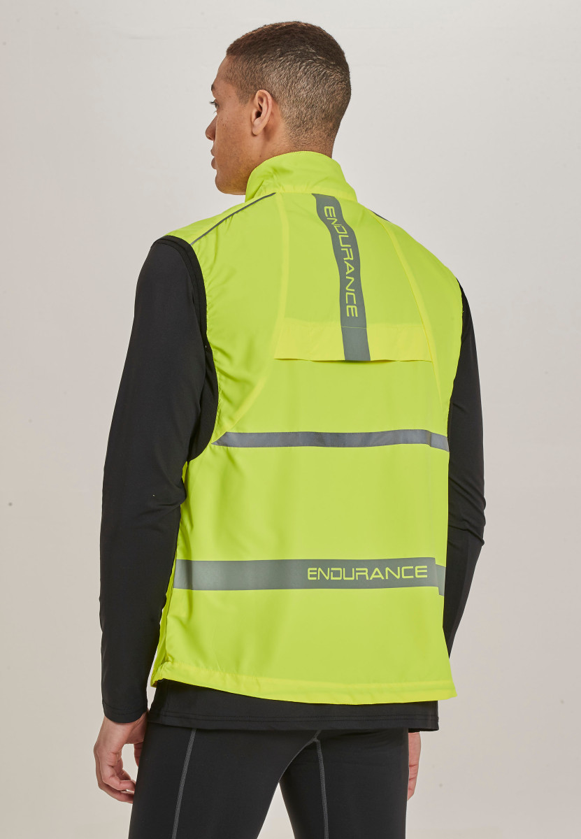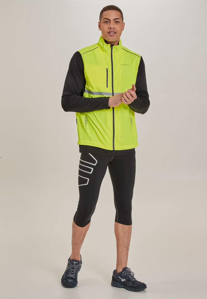 Safety frist! Die Funktions-Laufweste LAUPEN XQL von ENDURANCE gibt Sicherheit im Straßenverkehr, beim Laufen und Radfahren. Sie ist eine funktionelle und leichte Sportweste, die wunderbar atmungsaktiv ist und ein angenehm temperiertes Klima beim Sport bietet. Das dünne und hochwertige Material ist schnell trocknend. Am Rücken sowie an den Achseln sind zusätzlich atmungsaktive Mesh-Einsätze verarbeitet. Die Weste ist mit einem komfortablen Stehkragen ausgestattet, während der durchgehende Reißverschluss ist mit einem Kinn- und Reißverschlussschutz versehen ist. Die Brusttasche lässt sich ebenfalls mit einem Reißverschluss schließen. Der Bund kann mit einem Gummiband beliebig eingestellt werden. Sicherheit bieten die großen 360 Grad reflektierenden Elemente sowie die neongelbe Farbe. Die Weste begleitet Dich daher sicher auf Deinem Weg bei Tag, Dämmerung und Dunkelheit. Und auch sonst überzeugt das sportliche Design: Es ist stylisch und durchdacht und damit ideal für viele Sportarten. Tolles Extra: Du kannst die Weste bei 40 Grad einfach in der Waschmaschine waschen. Ein top Preis-Leistungsverhältnis gibt es obendrein!