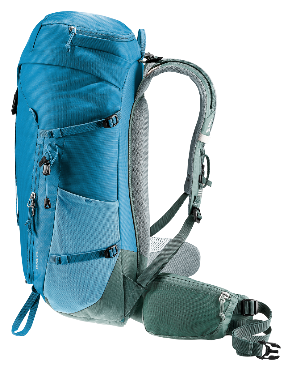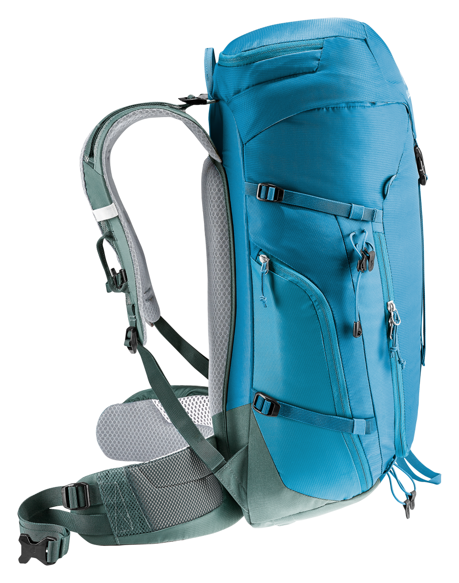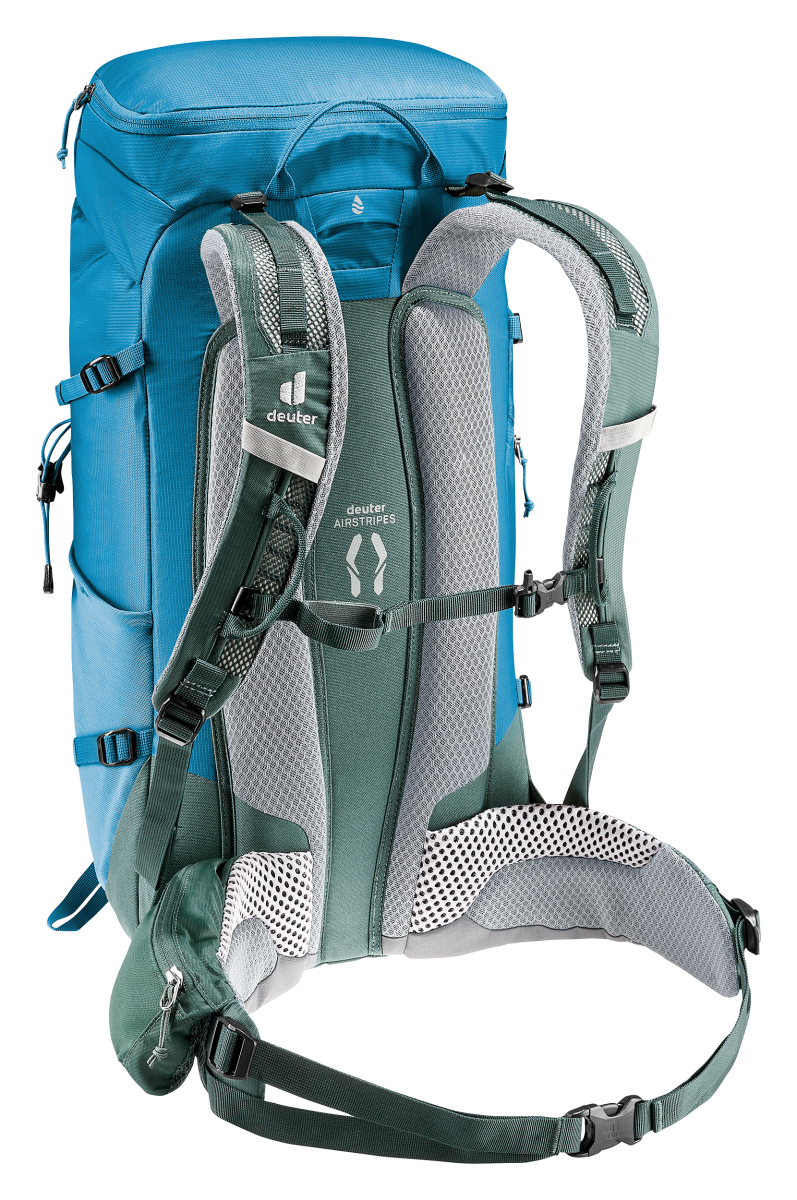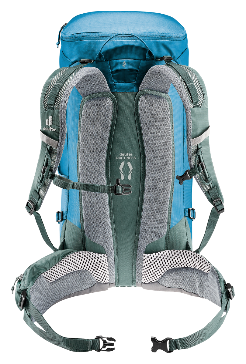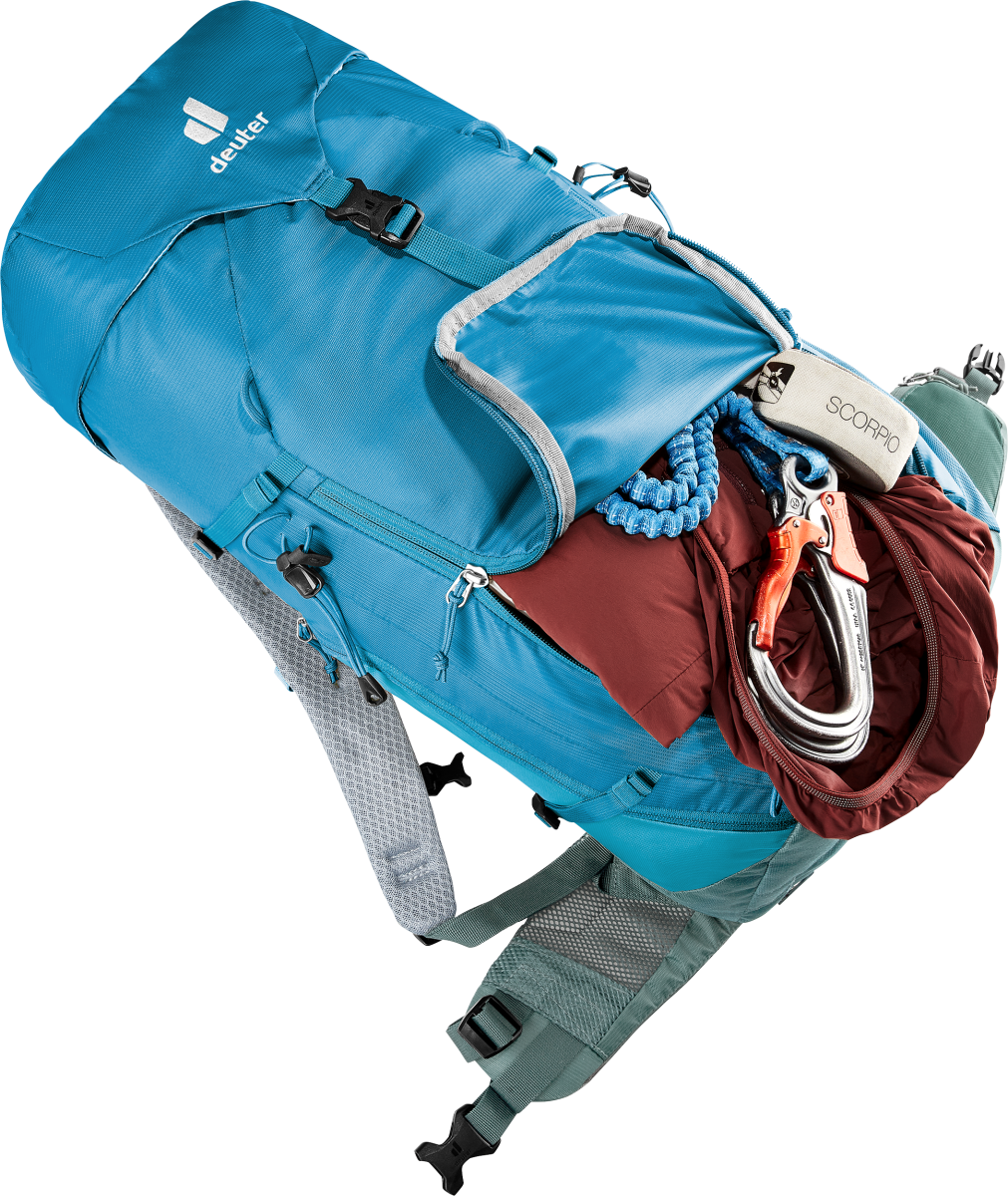 Das Airstripes Rückensystem mit geringer Rückenauflage und großen Belüftungskanälen sowie die perforierten Schulterträger und Hüftflossen mit Taschen sorgen für optimale Luftzirkulation, körpernahe Gewichtsverteilung und damit einen kompakten Sitz in jedem Terrain. Die flache Deckelkonstruktion bietet gute Kopffreiheit - auch mit Helm. Dank Fixierungen an den Schulterträgern sind die Karabiner des Klettersteigsets stets griffbereit. Zudem sind Equipment und Material dank großem Reißverschluss-Frontzugang und Seitentaschen schnell zur Hand.